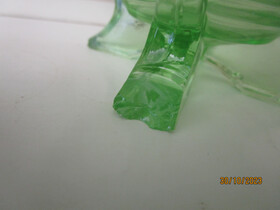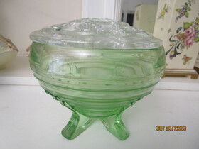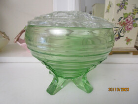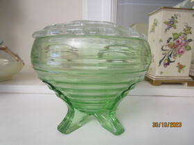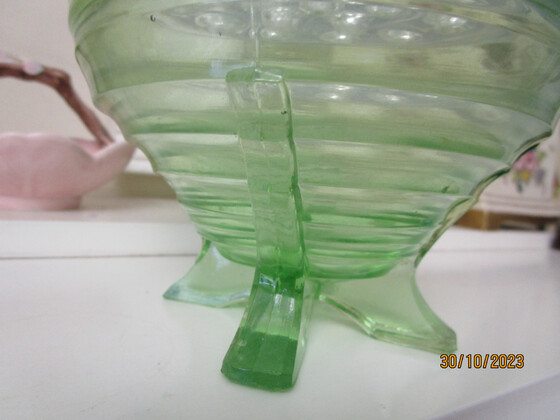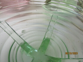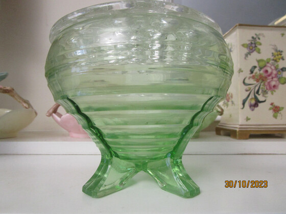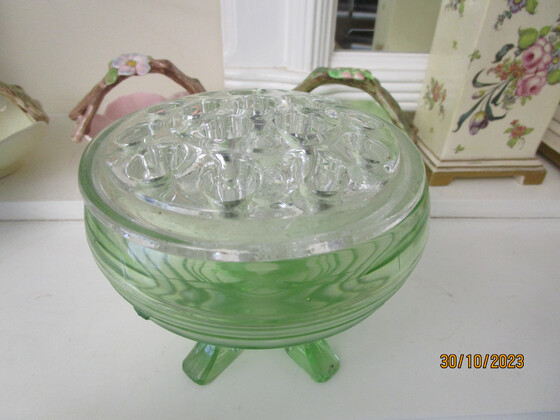 Here is an art deco green depression glass vase ( Sowerby?) with a clean glass flower frog which sits around the rim of the vase.