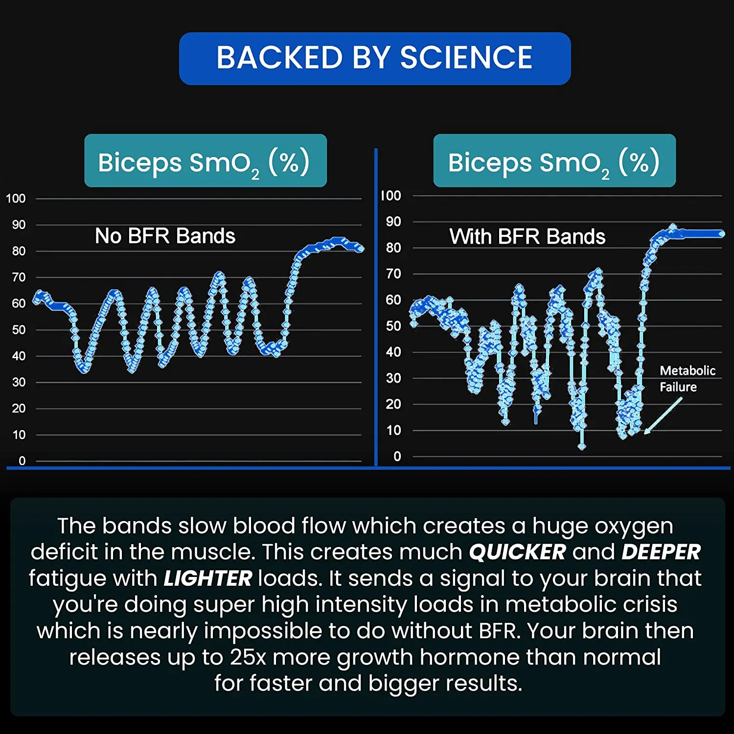 The Blood Flow Restriction (BFR) bands reduce oxygen supply to the muscles in order to pre-fatigue slow twitch muscle fibers and diminish their response to workout loads, but to enable fast twitch muscle fibers to respond quickly to exercise training loads, resulting in faster lean muscle growth.