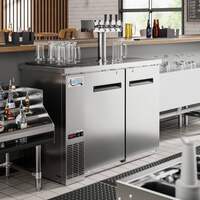 Unlike many competitive beer dispensers, this model ships with "D" system couplers so that you can tap kegs right out of the box! This commercial kegerator features a sleek stainless steel finish and a 1 1/2" thick stainless steel top that is both durable and extremely simple to clean, while a built-in drip tray further expedites end-of-day cleaning.