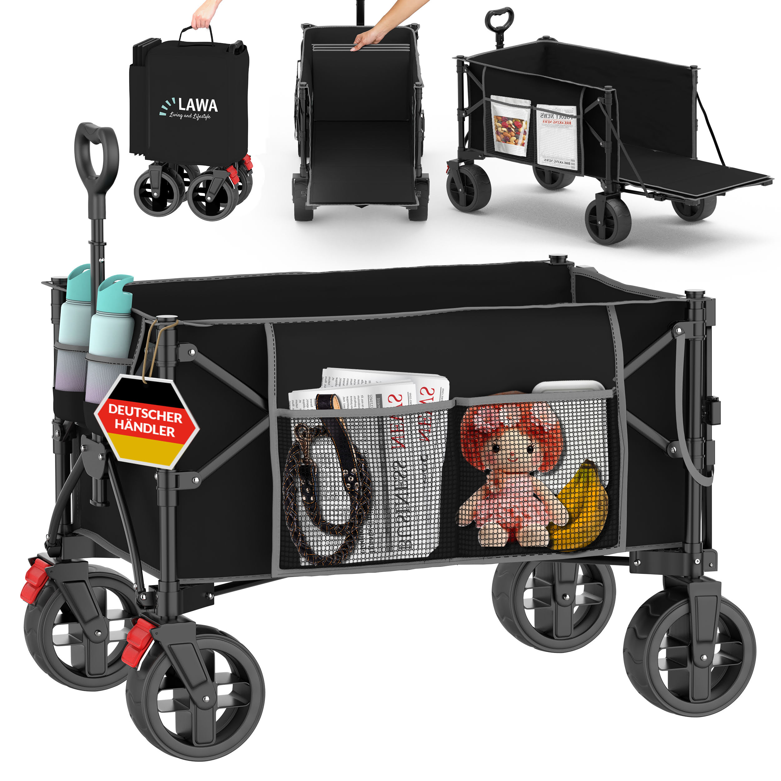 Klappbarer Bollerwagen 100kg mit Heckklappe Dach Seitentasche faltbar schwarz