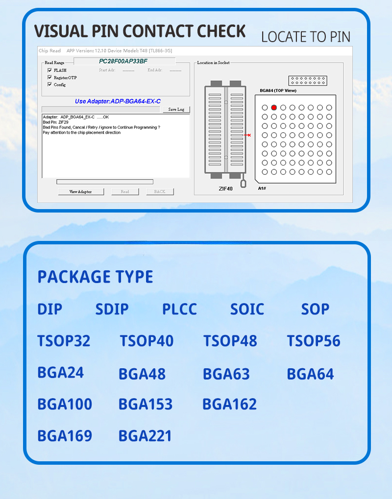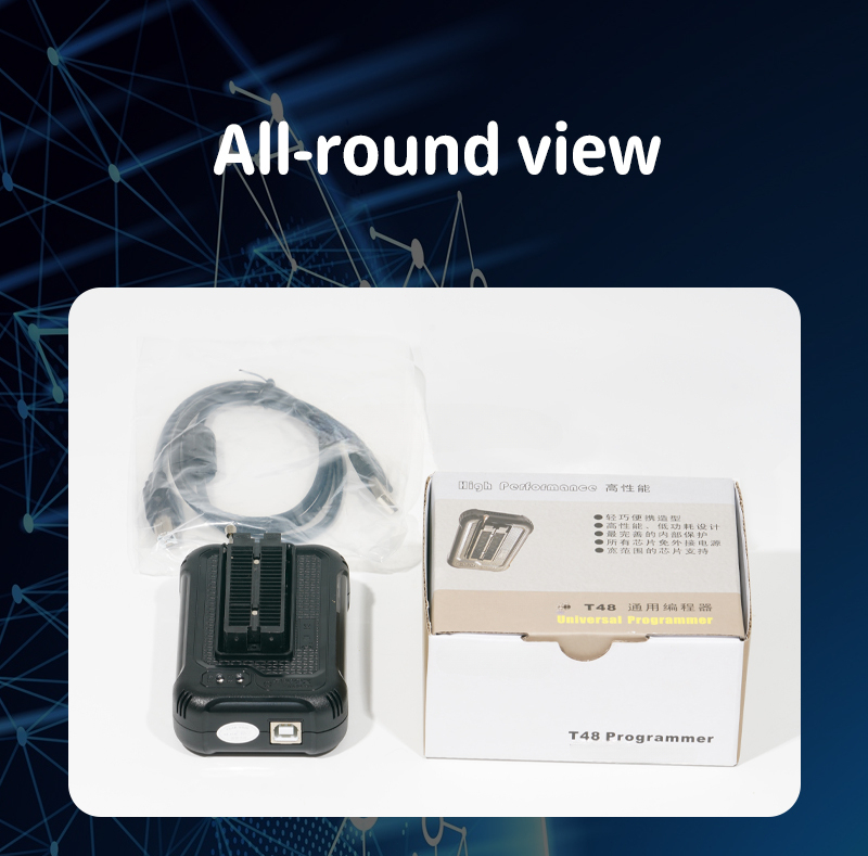 With 40-pin industrial high-quality ZIF Socket (Pluggable/replaceable), newest model T48 (TL866-3G) programmer is the improvement of TL866II Plus programmer. Based on 32-bit MCU with 120MHZ and 4-layer PCB design, this professional T48 programmer support high-capacity NAND EMMC up to 256GB and programming speed is much higher. Suppport high-voltage chips, VPP Maximum up to 25V, that is what TL866II cannot achieve. Production of high-density SMD technology, a unified user interface, easy to use, fully functional, reliable program running of application software, ultra-small (size is almost the same as TL866II), code-runs much faster, support multilanguage menu (English, Chinese, Russian, Polish, German, Spanish, Portuguese, Turkish, Czech, Italian), it can automatically identify the operating system to install and run under Windows XP,2003,2008,Vista Win7 WIN8 WIN10 WIN11. Overall, T48 offers significantly improved performance and excellent value for money.