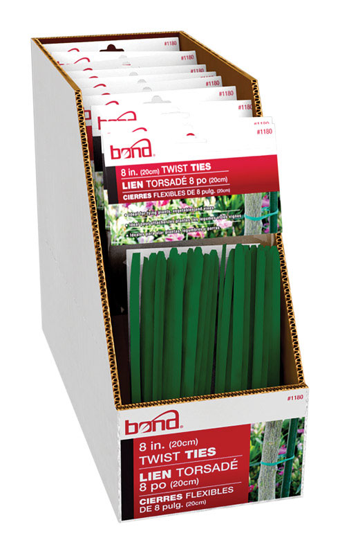 Material: Coated Wire *Number in Package: 100 *Product Type: Ties *Sub Brand: *Brand Name: Bond *Color: Green *Packaging Type: Display *Depth: *Height: *Width: *Indoor or Outdoor: Twist Ties