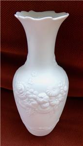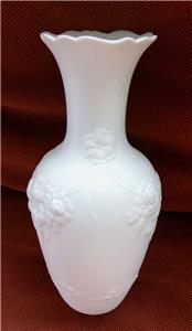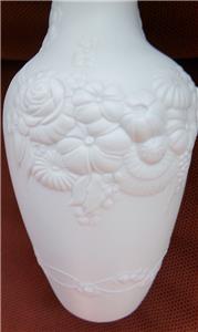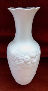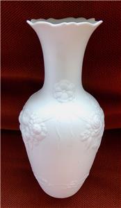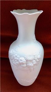 This auction is for a Kaiser West Germany matte white 10" porcelain bisque vase signed M. Frey in excellent condition, featuring a raised relief floral motif.
