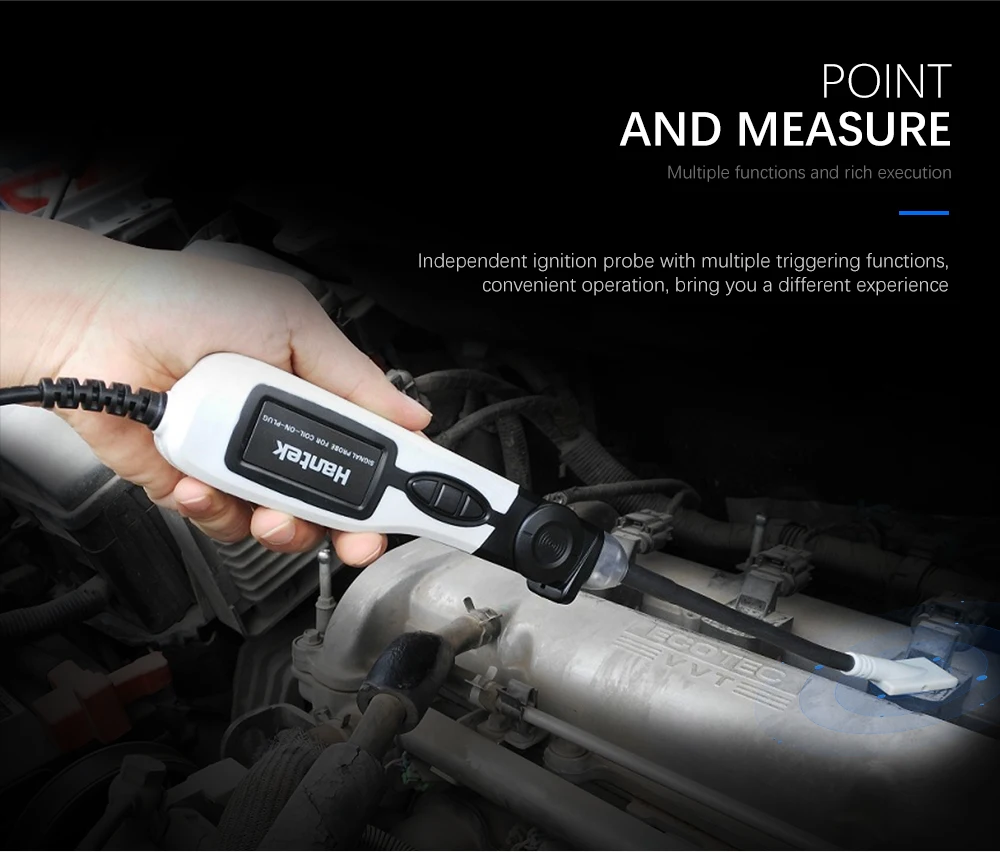 The HT25COP independent ignition probe can be used to obtain the automotive engine ignition waveform easily and quickly. The ignition waveform is a window through which we can see what happens in the engine combustion chamber, so as to determine whether the spark plug needs to be replaced or cleaned, and whether the fuel injector of the electric injection system works well. Is there a problem with cylinder sealing?Is the spark plug clearance larger?Is the shape of spark plug electrode pointed?Is there too much grease or carbon in the spark plug?Is the spark plug insulation deteriorating?Is there a problem with the battery power supply system?.It can be tested directly on the ignition coil without adding the ignition extension cord, which is simple and convenient.Can be used with ordinary oscilloscope, unique anti-jamming design, high test accuracy.Ergonomically designed to bend at will, it provides a bright LED lamp for easy operation at night or in poor light conditions.