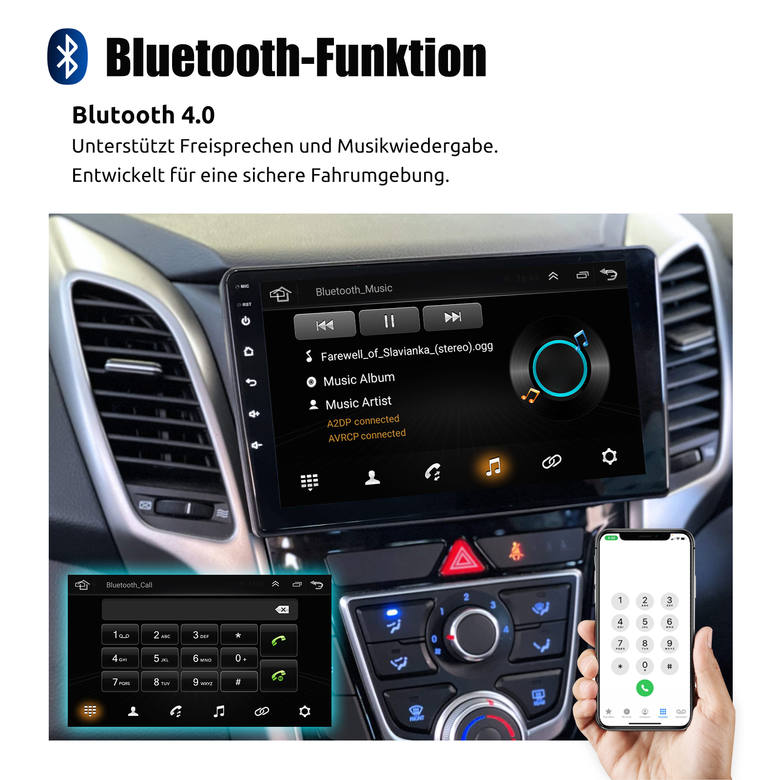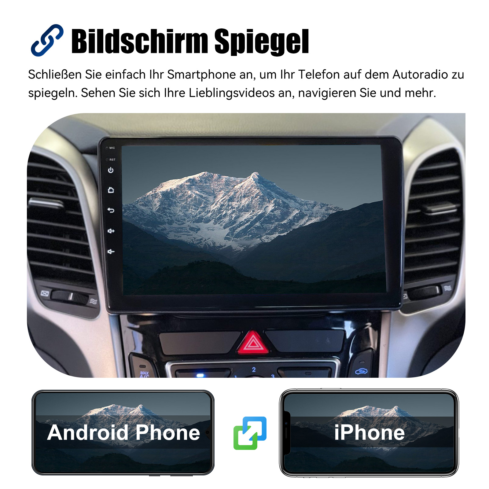 Bildschirm Spiegel für iOS/Android: Das Autoradio unterstützt Mirror Link für iOS/Android-Telefone. Nachdem Sie das Radio angeschlossen haben, können Sie die Telefonseite mit dem 9-Zoll-Touchscreen des Radios synchronisieren. Das iPhone stellt eine Verbindung über WLAN her, und das Android-Telefon stellt eine Verbindung über WLAN oder das Original-USB-Kabel her (gilt nicht für Samsung- und Huawei-Telefone).