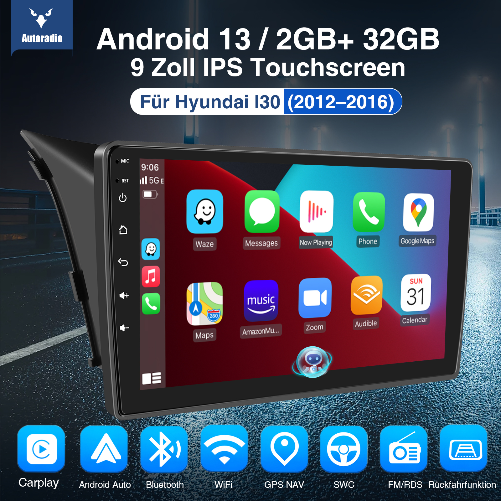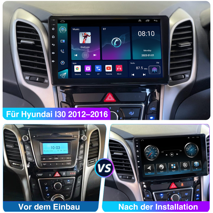 9 Zoll Android 13 Autoradio für Hyundai i30: Das Android Autoradio mit 9" 1024* 600 HD IPS kapazitivem Touchscreen, 2GB RAM und 32GB ROM ermöglicht das Herunterladen Ihrer Lieblings-Apps und -Videos, damit das Autofahren nicht mehr langweilig wird. Kein zusätzlicher Rahmen, kein Kabelwechsel, Plug and Play.
