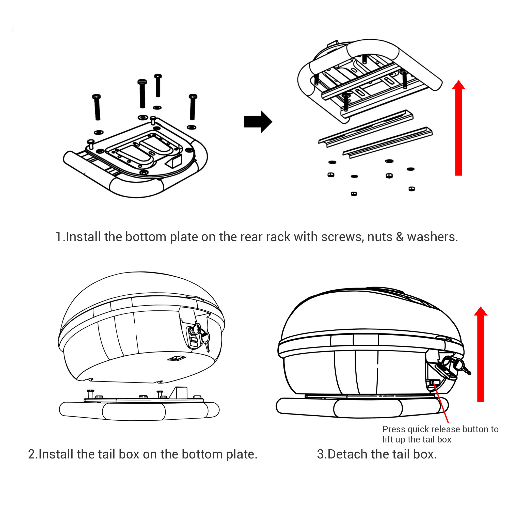 - Great Compatibility & Easy Installation - Compatible with motorbikes, scooters, cruisers or other motorcycles with rear luggage rack; Comes with a universal mounting plate, brackets, screws & nuts for easily attaching the tail box to the rear rack of your motorcycle