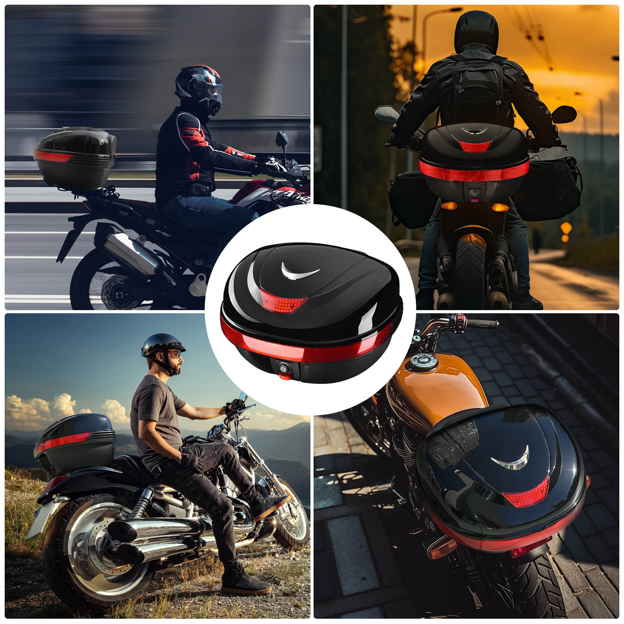 17" x 15" x 11" Motorcycle Tour Tail Box features 35L large capacity for easy carrying your helmets, raincoats, water bottles, etc., along with a universal mounting plate for allowing you to attach the tail box to the rear rack of the motorcycles. It features reflective strips to provide safety for night riding.