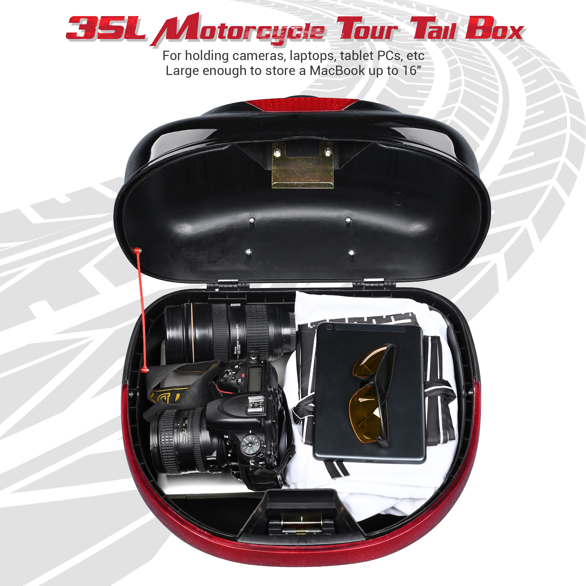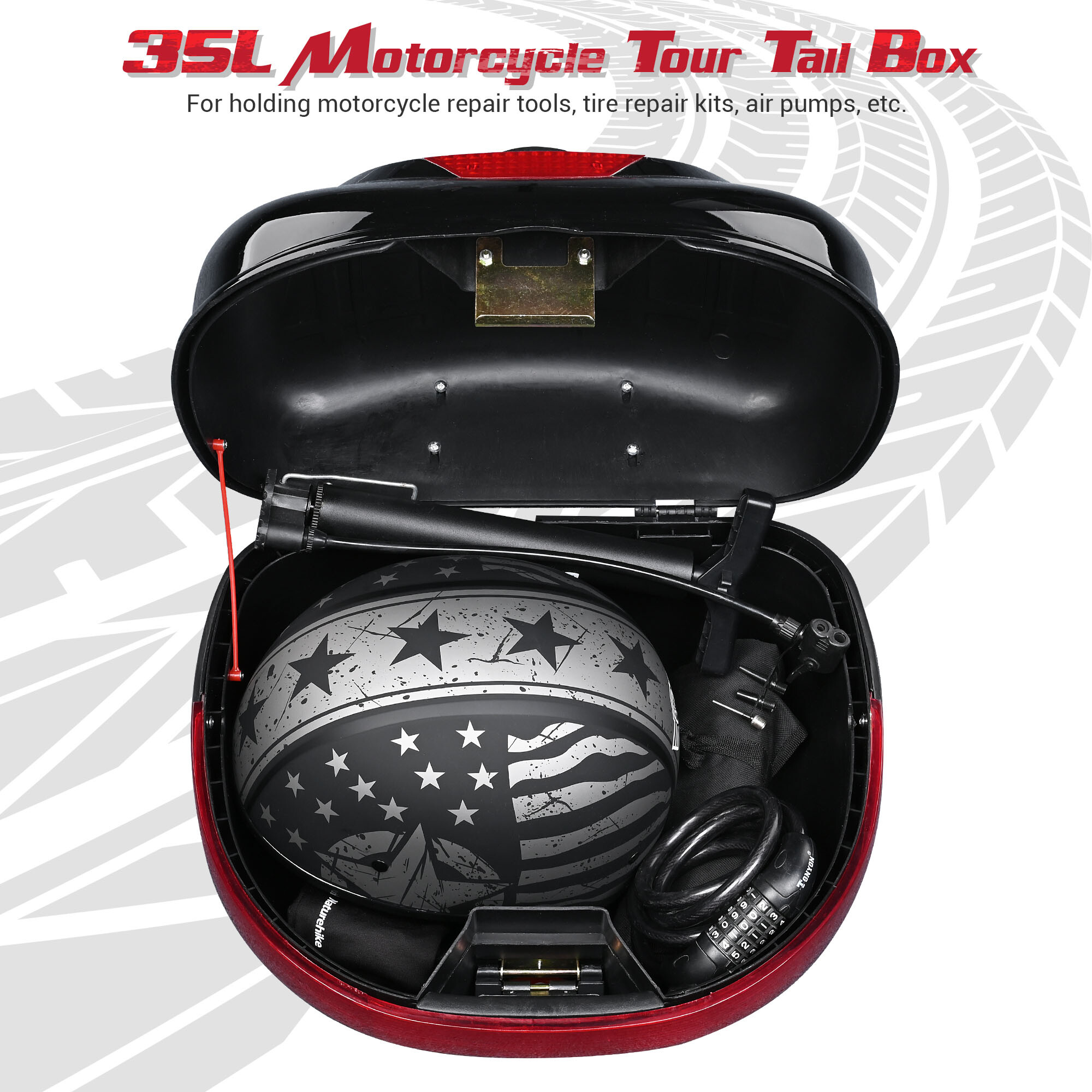 - 35L Large Capacity - 17" x 15" x 11" Motorcycle Tour Tail Box features 35L large storage capacity for easy holding 1pc helmet including full face helmets or half face helmets, also allowing you to keep your raincoats, bags, water bottles, motorcycle covers, laptops, cameras, motorcycle repair tools, etc., suitable for commuters or travelers