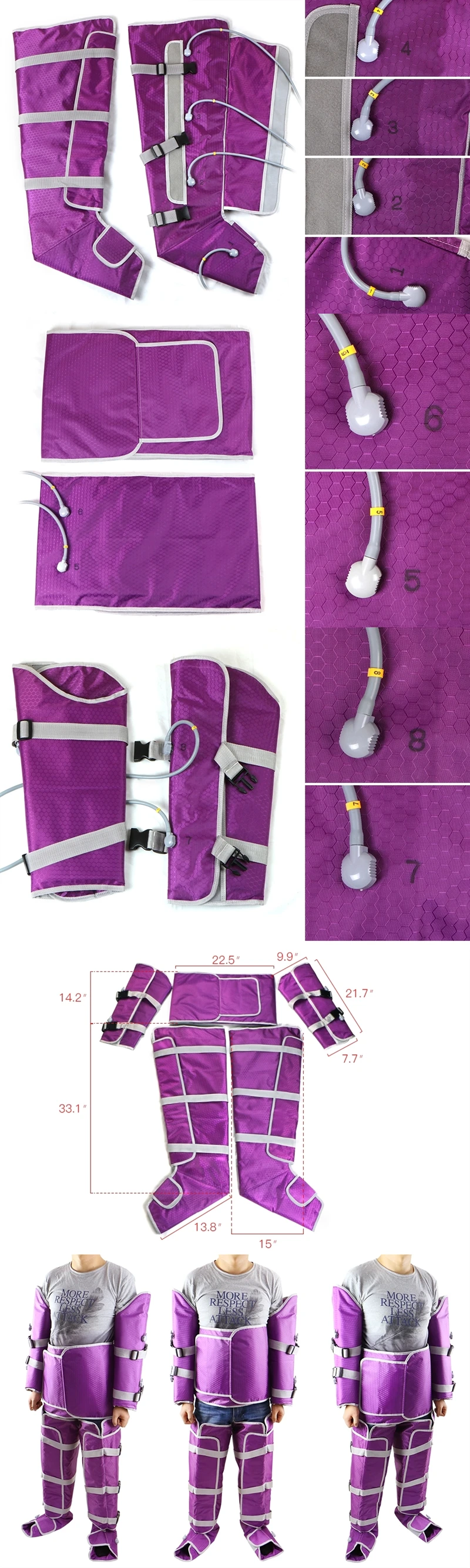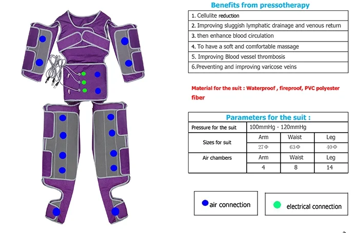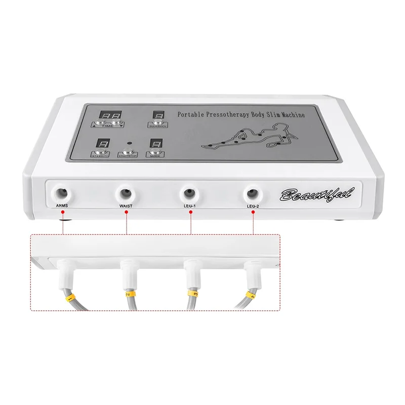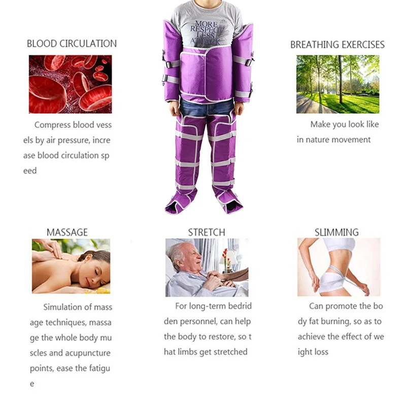 The air is automatically pumped into pneumatic chambers of the boot. The Machine can apply a pressure that reaches 100mmHg or even 120mmHg.With this strong pressure ,the machine can automatically adapt the patient's blood pressure and help all parts of body do the deep lymphatic drainage massage ,then enhance blood circulation . If you use a good anti-cellulite cream,it will add to the results of the treatment.