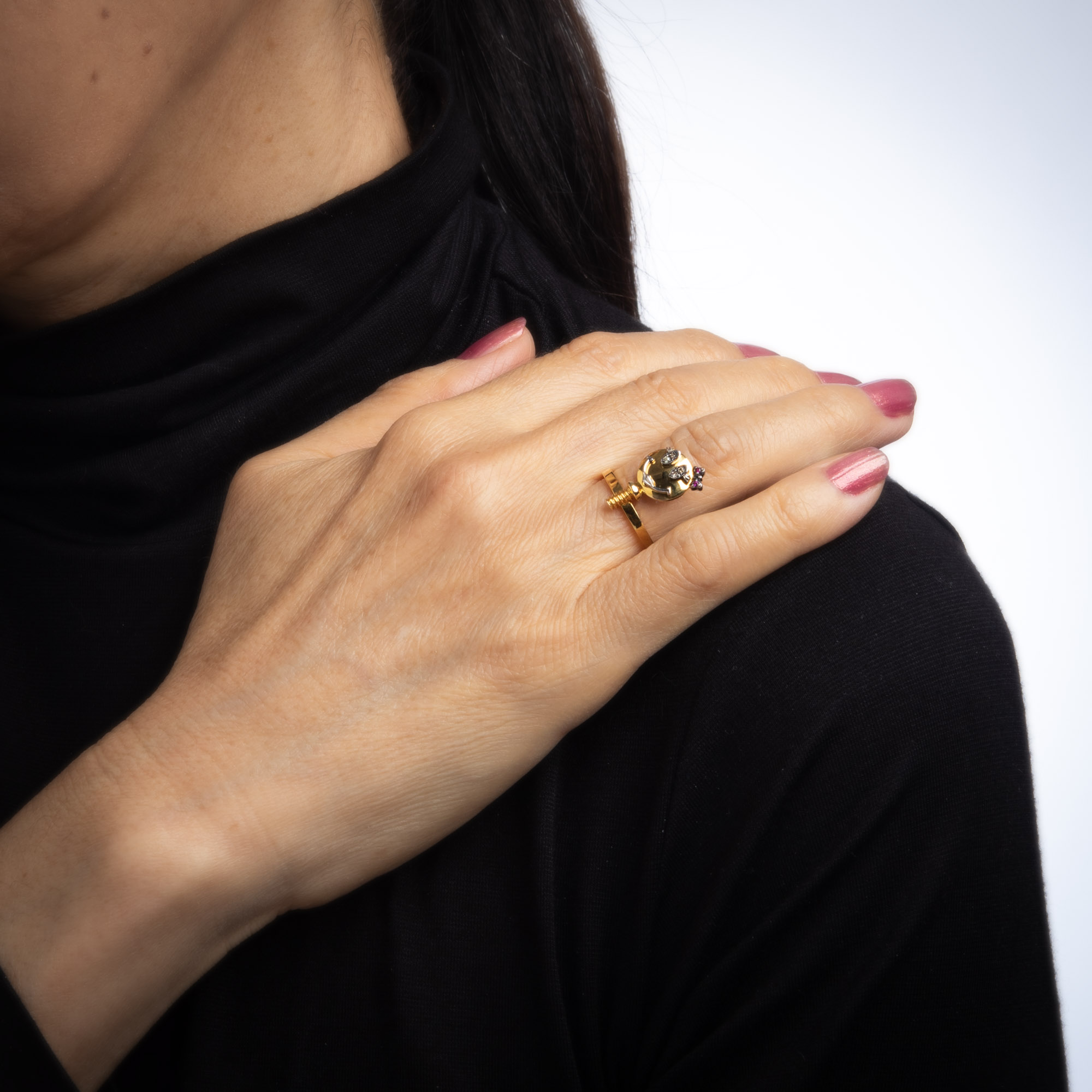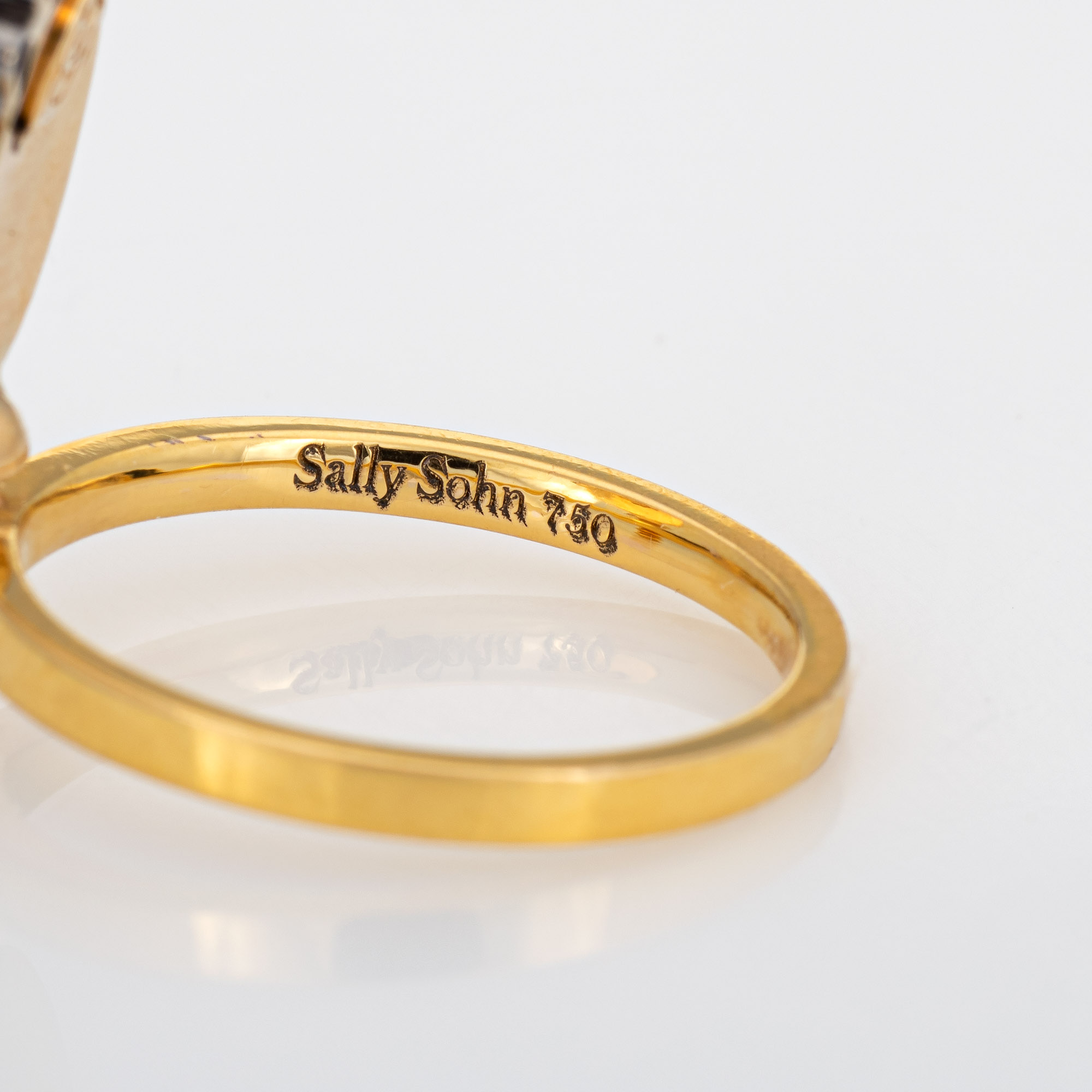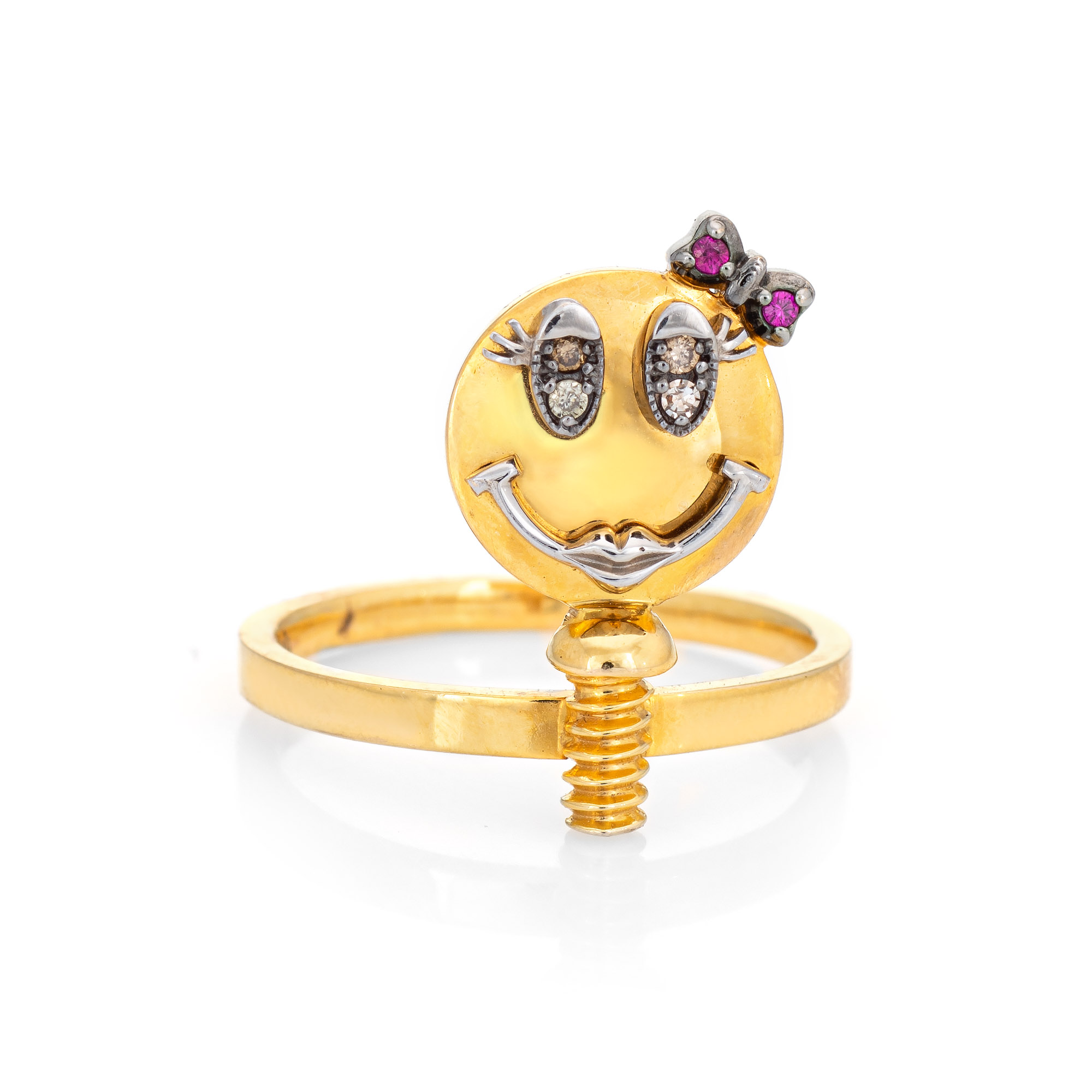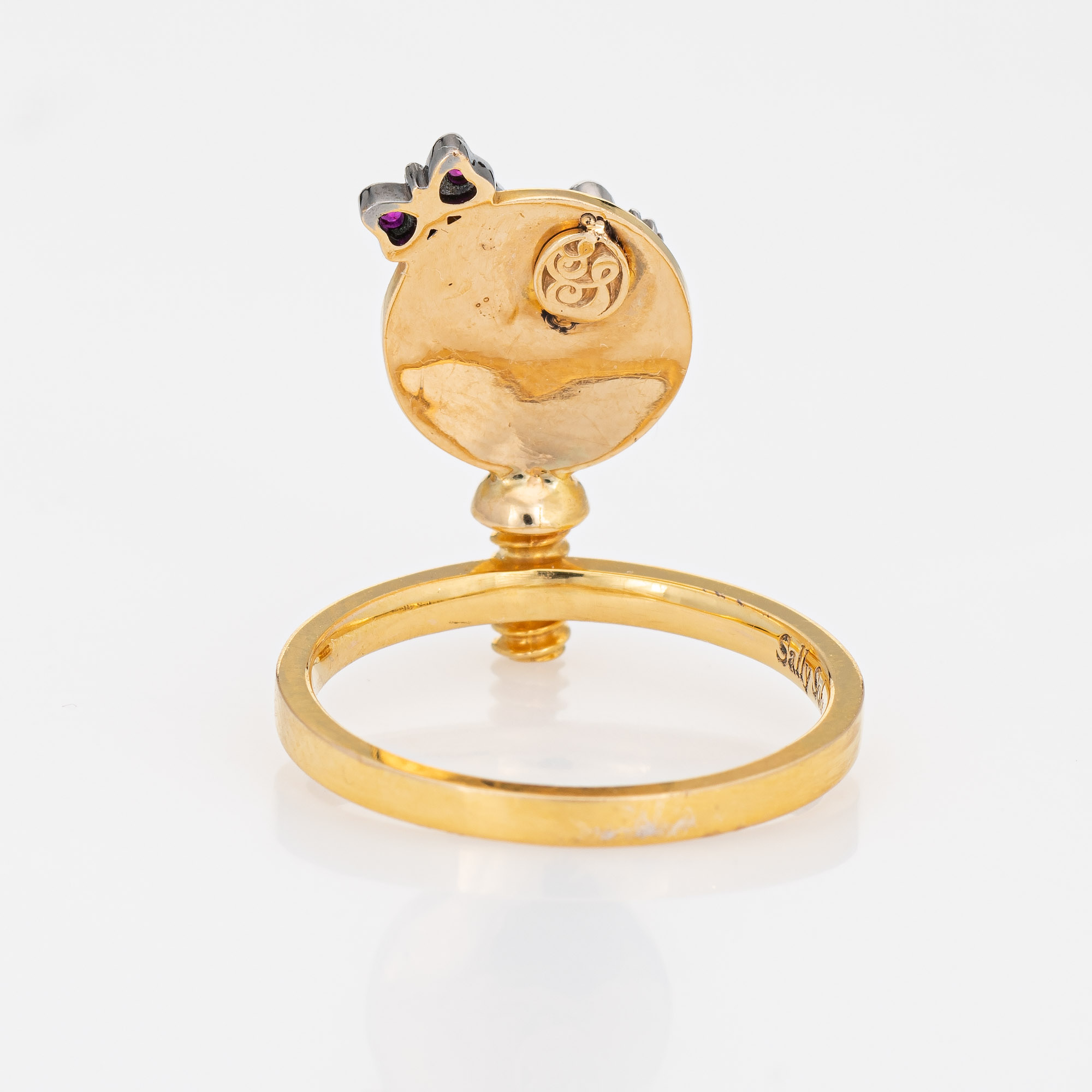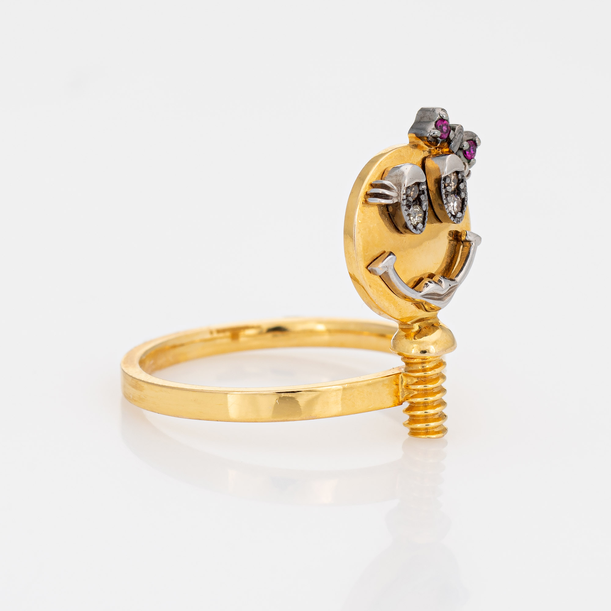 Overview: Stylish Sally Sohn happy face ring crafted in 18 karat yellow gold. Diamonds total an estimated 0.02 carats and rubies total an estimated 0.01 carats. Sally Sohn is a South Korean jewelry designer known for one-of-a-kind wearable works of art. The unique gemstone set Happy Face makes a statement on the hand. The low-rise ring (4mm - 0.15 inches) sits comfortably on the finger. The ring is in very good condition and was lightly cleaned and polished. Particulars: Weight: 4 grams Stones: Diamonds total an estimated 0.02 carats and rubies total an estimated 0.01 carats. Metal & Hallmark: 18 karat yellow gold. The ring is hallmarked "750" for 18k gold and "Sally Sohn"Size & Measurements: The ring is a size 5 1/4 (sizable). The mount measures 16.5mm in length (0.64 inches) and 10mm wide (0.39 inches) rising 4mm from the finger.