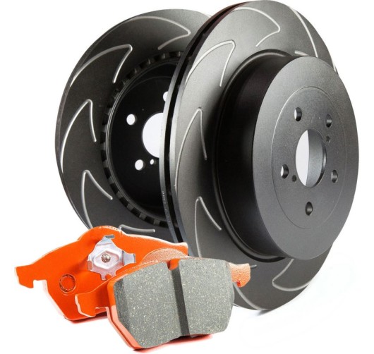 EBC's S8 brake pad and rotor kit features its race-spec Orangestuff brake pads and its dimpled and slotted GD brake rotors for maximum braking efficiency. The Orangestuff pads have an aggressive compound that can stay effective up to 1300-degree F and the GD rotor’s innovative dimples and strategically-placed slots remove hot gasses from the brake pads to keep them from fading.