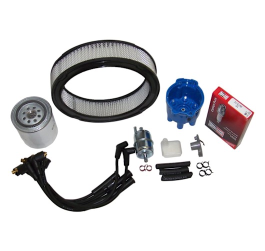 Includes: Distributor cap and rotor, air filter, oil filter, fuel filter, spark plugs, spark plug wire set