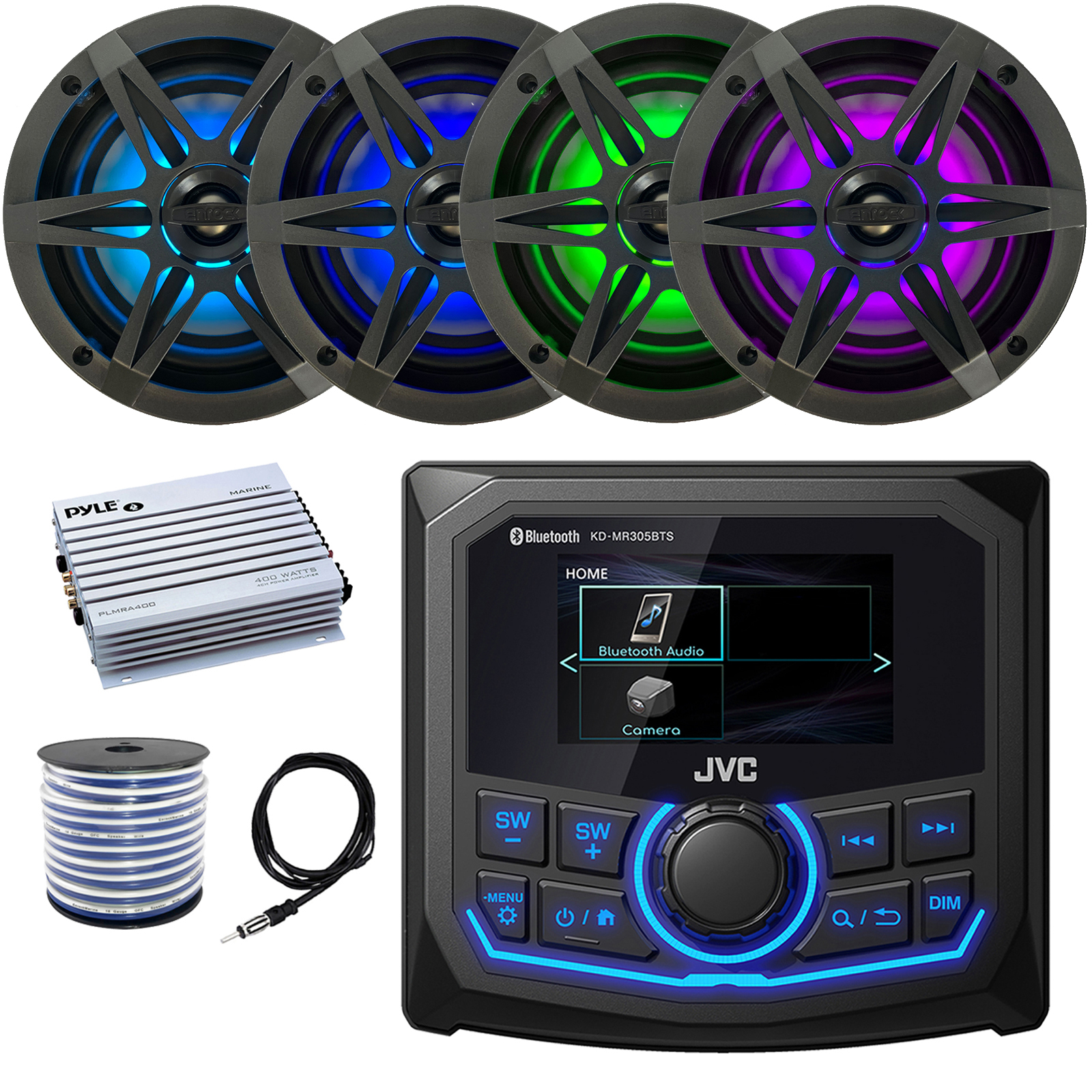 JVC 2.7" LCD Display Marine Bluetooth AM/FM/WB Receiver, 4x 6.5" 120 Watt Max Power Charcoal Boat Audio Speakers w/ MultiColor LED, 400 Watt 4 Channel Amplifier, Antenna, Speaker Wire