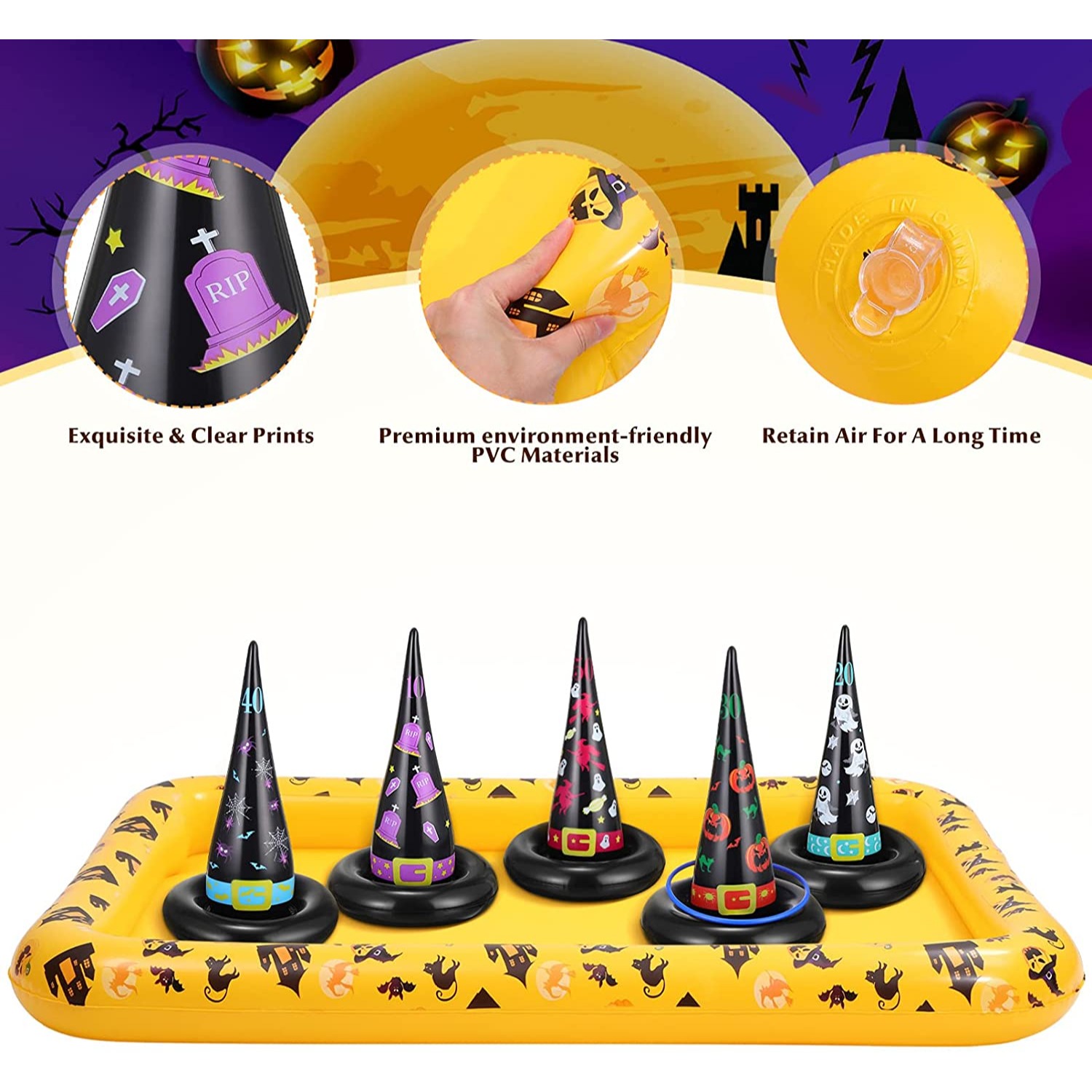 This Halloween ring toss game set will be a great hit in Halloween party. Include 5 piece inflatable witch hats, 10 piece two sizes plastic rings to set up different challenges, air pump inflatable game board . Very easy to set up even by children. Let's set up and play with your family and friends to compete who will get the highest point!