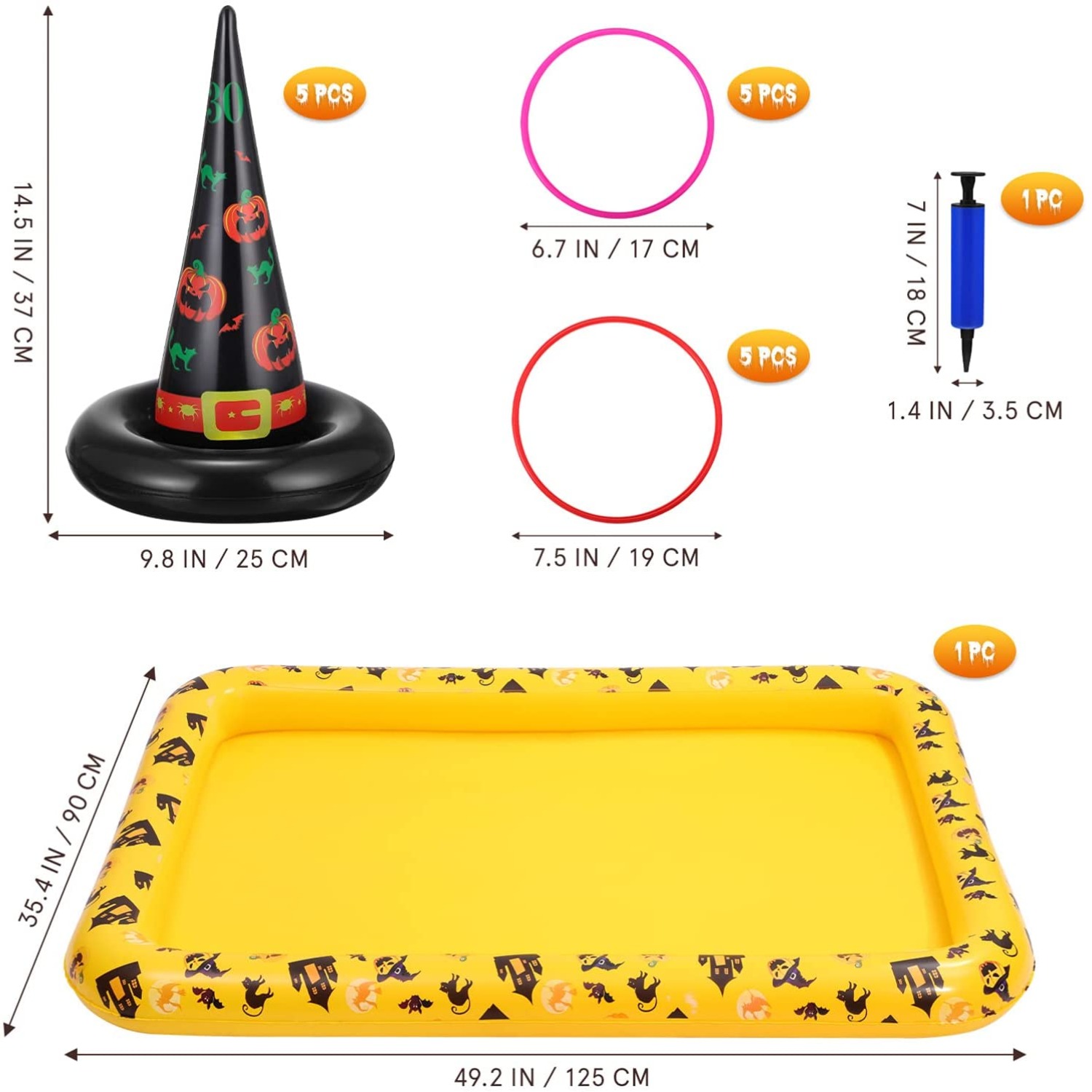 • Package includes: 5 piece inflatable witch hats (14.5"x9.8"), 10 piece plastic rings in two sizes (7.5"/6.7"), inflatable base (49.2"x35.4") and air pump.