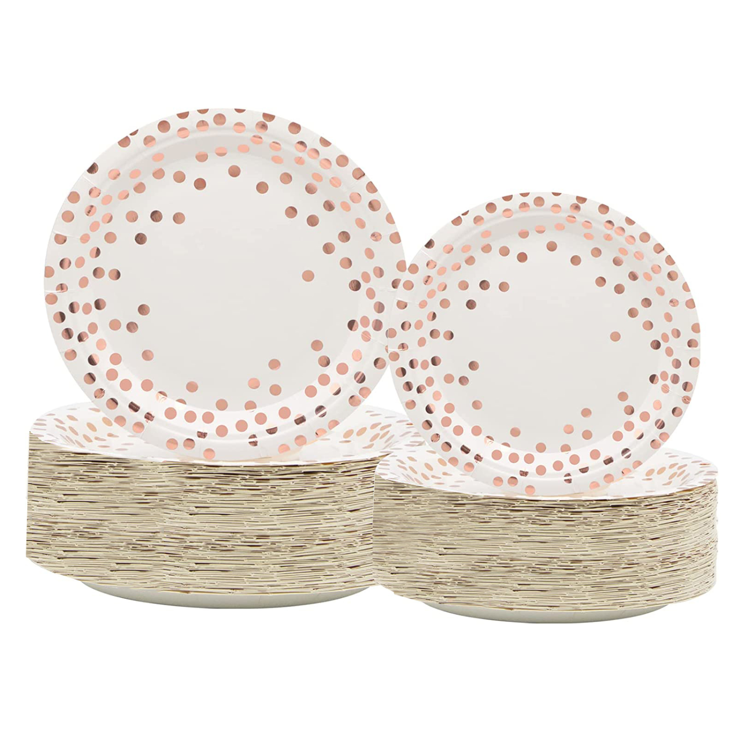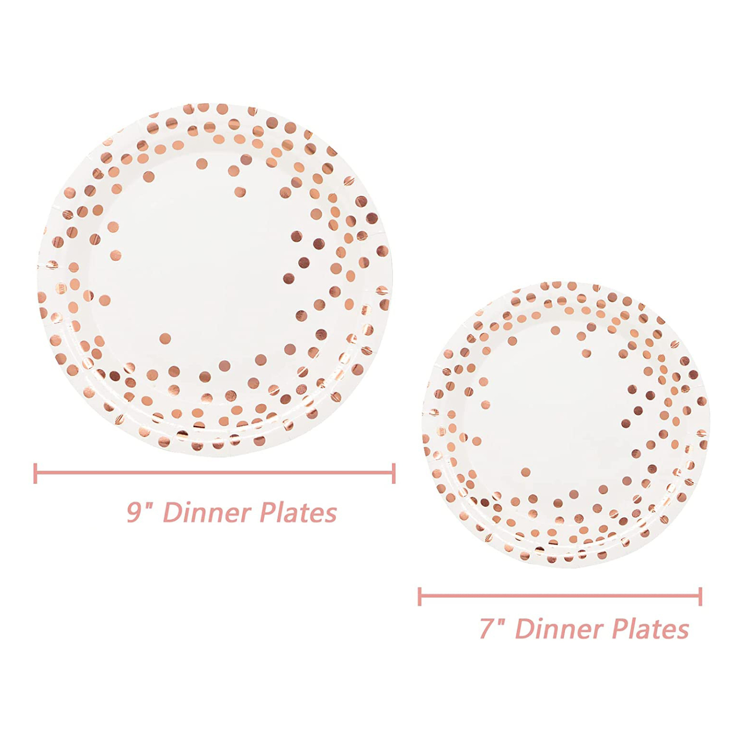These attractive disposable plates are designed with rose gold dot on a white background with elegant accent. The consistent rose gold foil dot and the fine design makes this a perfect product to complement any color scheme or party motif.