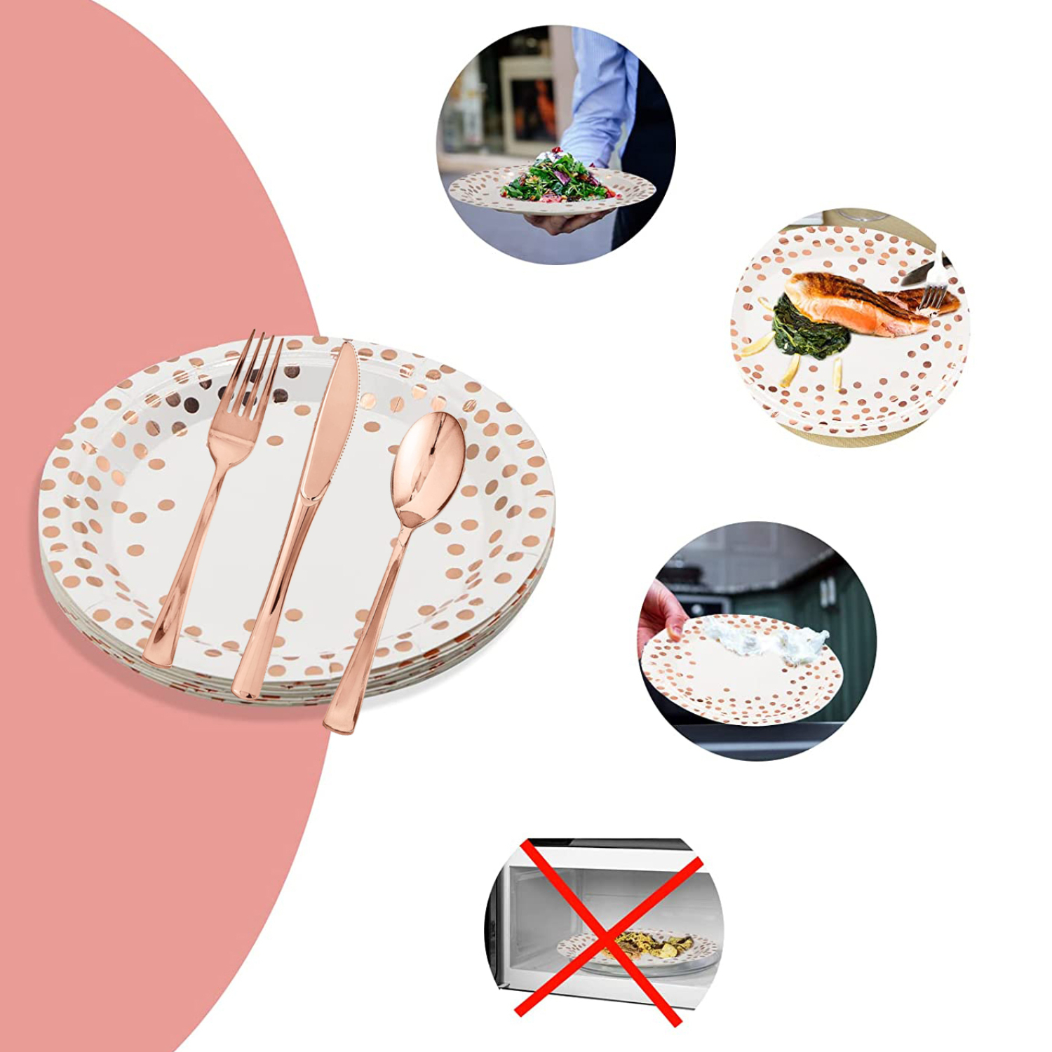 CONVENIENT and EASY CLEAN-UP: Save clean up time by throwing the paper plates and plastic silverware out after use, while still enjoying the decorative and elegant accent they add to your event. Please don't microwave the plates