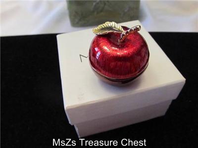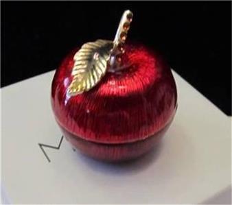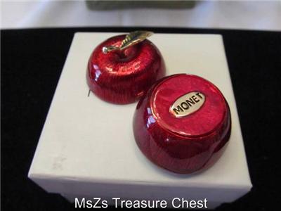 Up at auction for your consideration is a Retired MONET "Red Apple" collectable enamel trinket box, complete with gift box. This retired piece is appx 1.5" H x 1.25" Diameter at its longest points. It has the Monet stamp on the bottom and comes in a gift box. See pictures for more details.