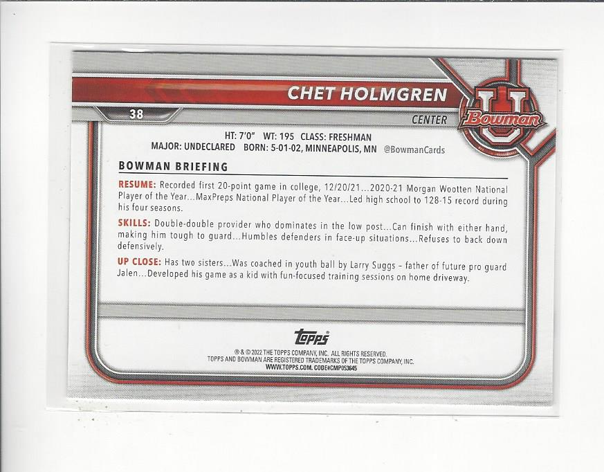 2021-22 Bowman University #38 Chet Holmgren Rookie Gonzaga Thunder