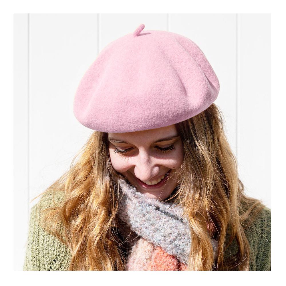 Classic wool beret in baby pink with inner crown cuff for the perfect fit.