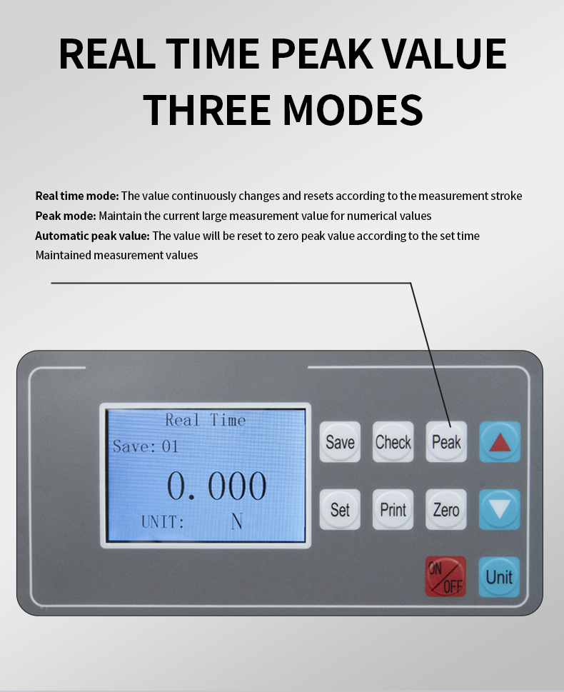 - Three kinds of measurement units can be selected(N, Lb and Kg); inter-conversion is available