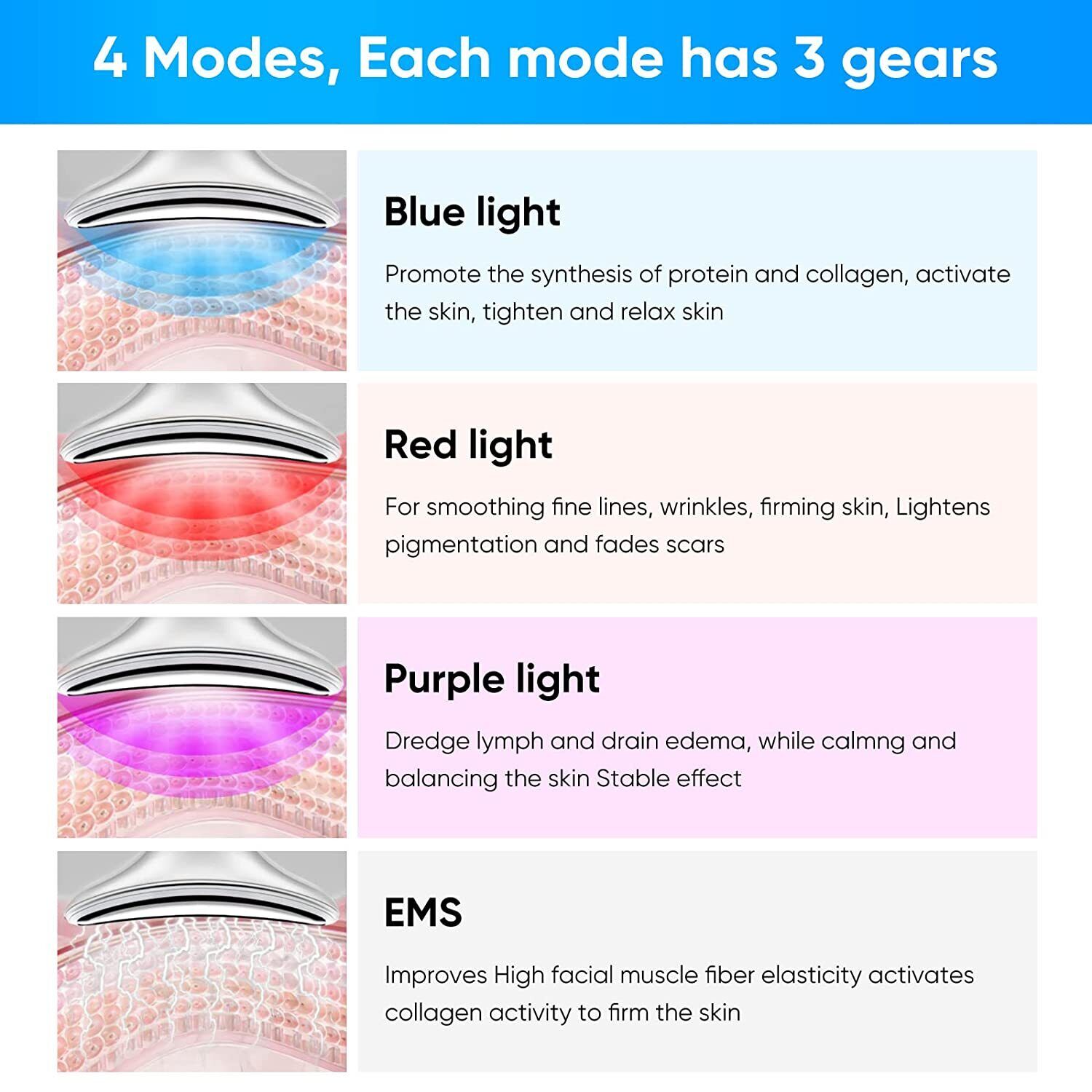 3. Four modes, three intensity adjustments, accelerate blood circulation, promote collagen production, dredge meridians, shrink pores, and rejuvenate the skin.