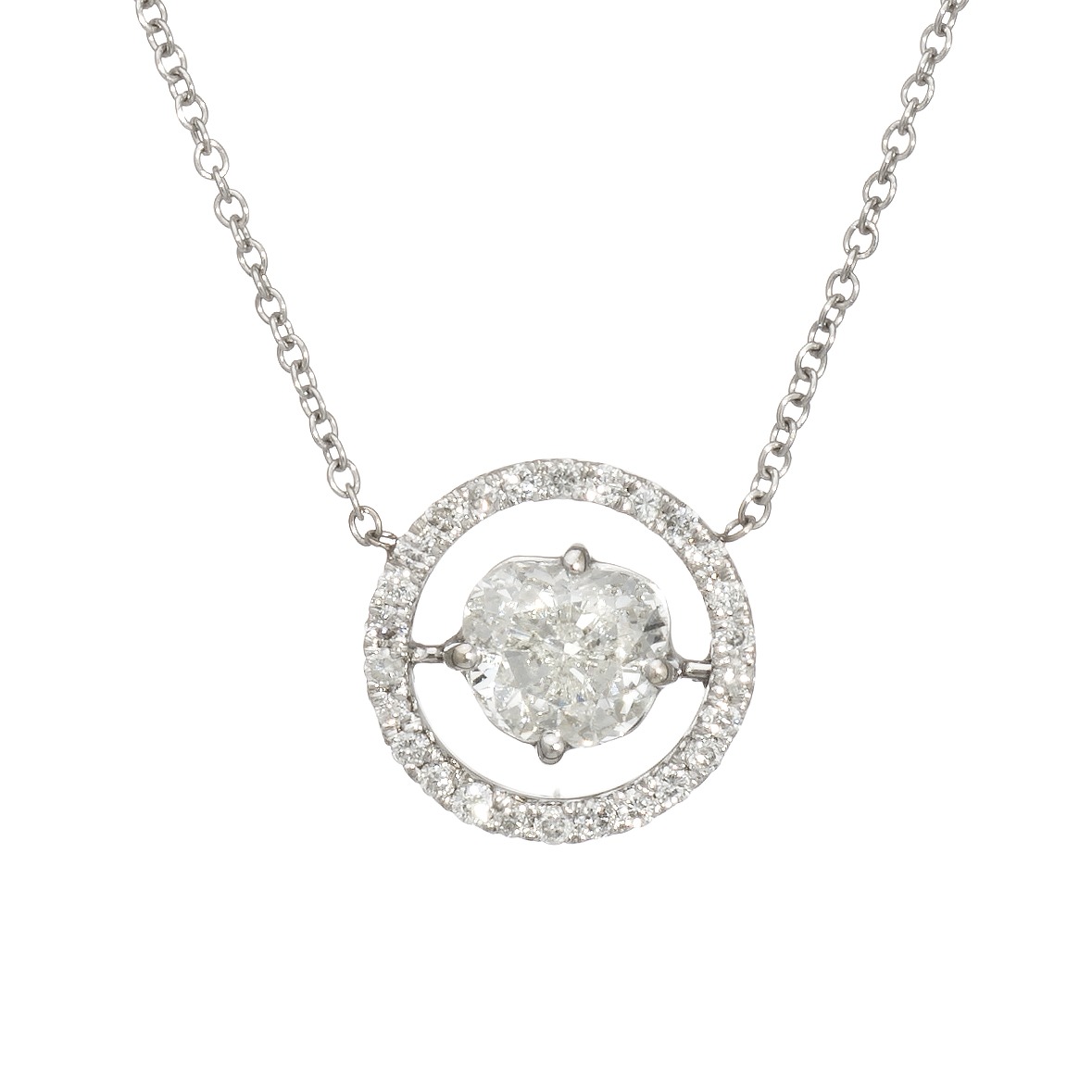 Overview: Stylish and finely detailed diamond halo necklace crafted in 14k white gold. Faceted brilliant cut (modified heart shape) is estimated at 0.80 carats, accented with 26 diamonds totaling an estimated 0.13 carats (estimated at I-J color and SI1-I2 clarity).