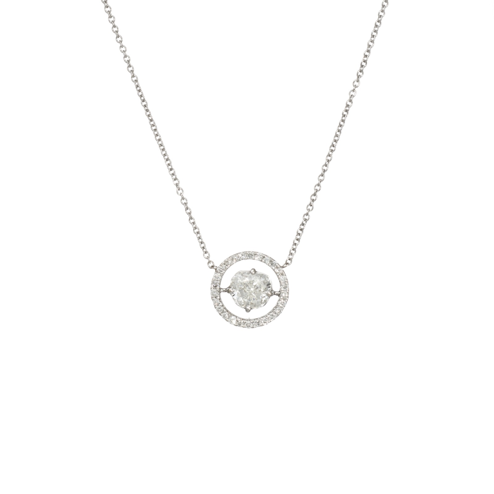 The chic necklace is set with a modified heart shaped diamond to the center, accented with a halo of diamonds. The necklace is great worn alone or layered with your fine jewelry from any era.