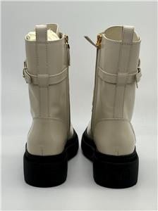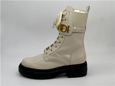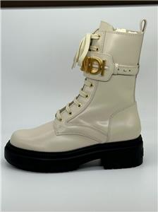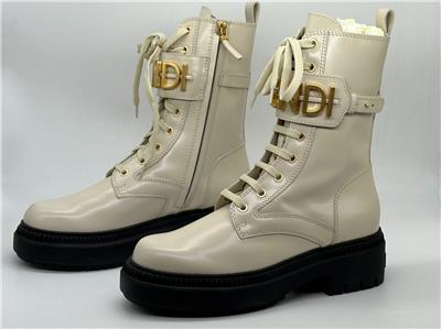 - Golden logo lettering spans across the shaft of this glossy leather combat boot anchored on a lug sole.