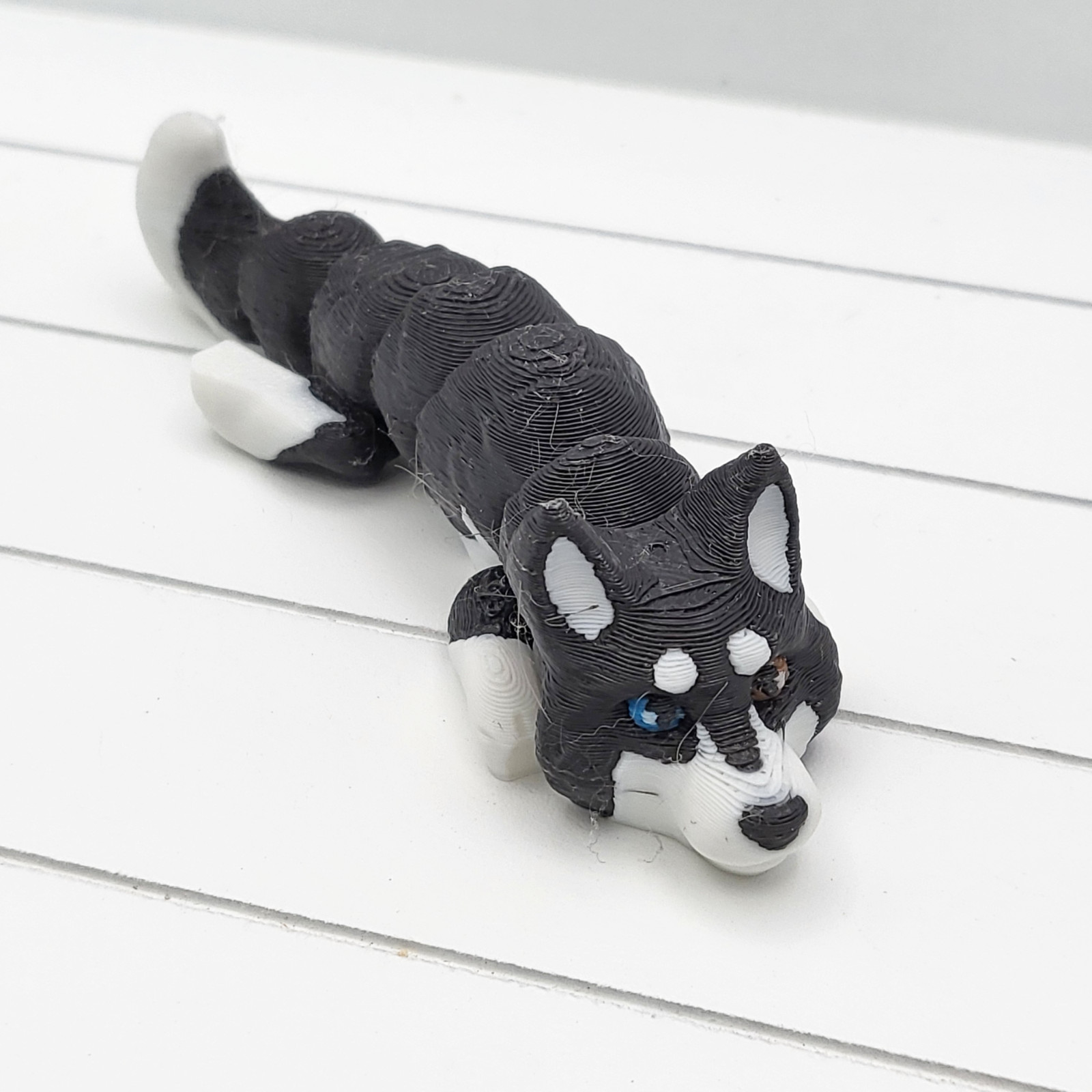 This 3D printed Husky Flexi Keyring is a versatile accessory that can be used as a fidget toy, keyring or backpack charm. Made of durable plastic, it features an articulated design and comes in a multi-coloured theme that is sure to catch the eye.The split ring allows for easy attachment to keys or bags, making it an ideal collectable for those who appreciate unique and functional items.Crafted in the United Kingdom, this keyring is perfect for fans of dog-themed toys and collectables. Get your hands on this adorable and practical item, and add a touch of fun to your daily routine.These are 3D printed in Coloured PLA.Size: Length 100mm x Width 30 mm approxComes with split ring so you can attach to your keys or bag. == INFORMATION ==Due to the nature of 3D printing, there may be small imperfections or layer lines. These are all normal parts of the 3D printing process and cannot be avoided.Please keep in mind that you will receive a unique item. Our Rainbow filaments transition through many colours. Dual & Tri Colour filaments consists of multiple colours. We do not have control over the exact colour positions on the model so your model may be slightly different from our photos.== CLEANING ==To clean the plastic, do not expose to high heat. The bio-sourced plastic is affected by temperatures above 65 degrees Celsius (150 Fahrenheit).Gently wash with soap and slightly warm water.=== DISCLAIMER ===These are NOT intended for small children or for unattended use as they do have many small parts that can become unattached and become a choking hazard or hazard in general. We take no responsibility for the misuse of this item.