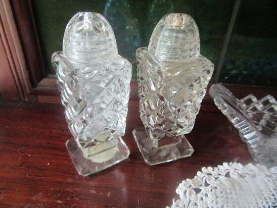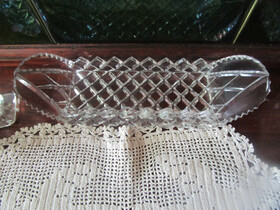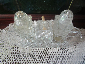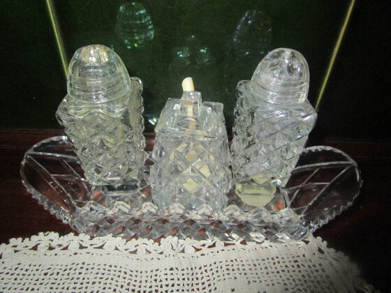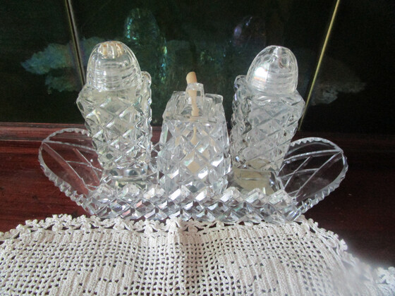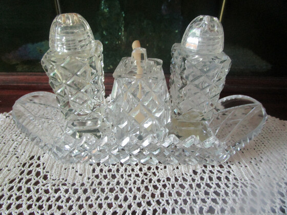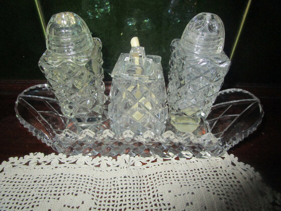 VINTAGE DIAMOND CUT CRYSTAL CRUET SET ON TRAY