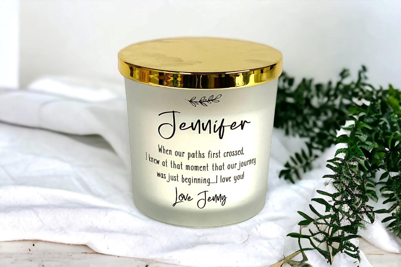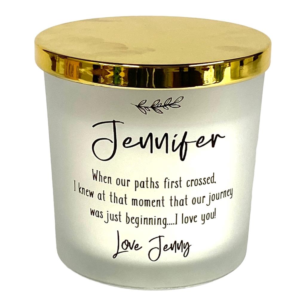 A beautiful candle in with frosted glass, making it ever so special. This lovely candle comes boxed and personalised for that special occasion. The candle measures 10cm x 10cm