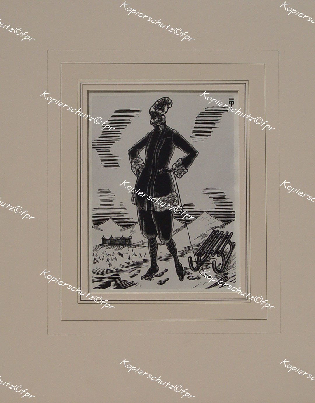"St. Moritz. Sportkostüm von Bresser." originaler Holzschnitt ca.20,5x15cm (Darstellung/Image size) auf Kunstdruck-Papier (30x22,5) von Preisser; unterhalb der Darstellung typographisch betitelt und bezeichnet; Tafel Nr. 4 aus dem Heft VIII/IX der Zeitschrift "Styl. Blätter für Mode und die angenehmen Dinge des Lebens." Berlin um 1922