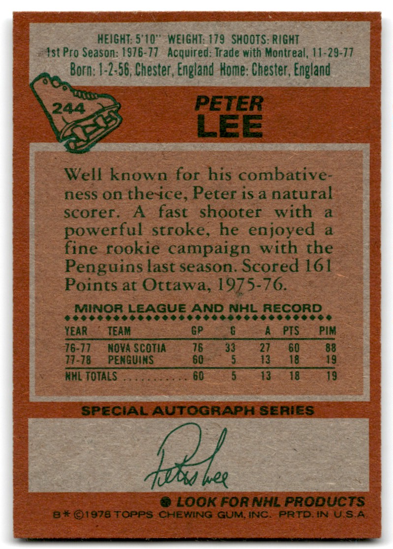 | 1978-79 Topps Hockey Cards Peter Lee Rookie Pittsburgh Penguins #244 |