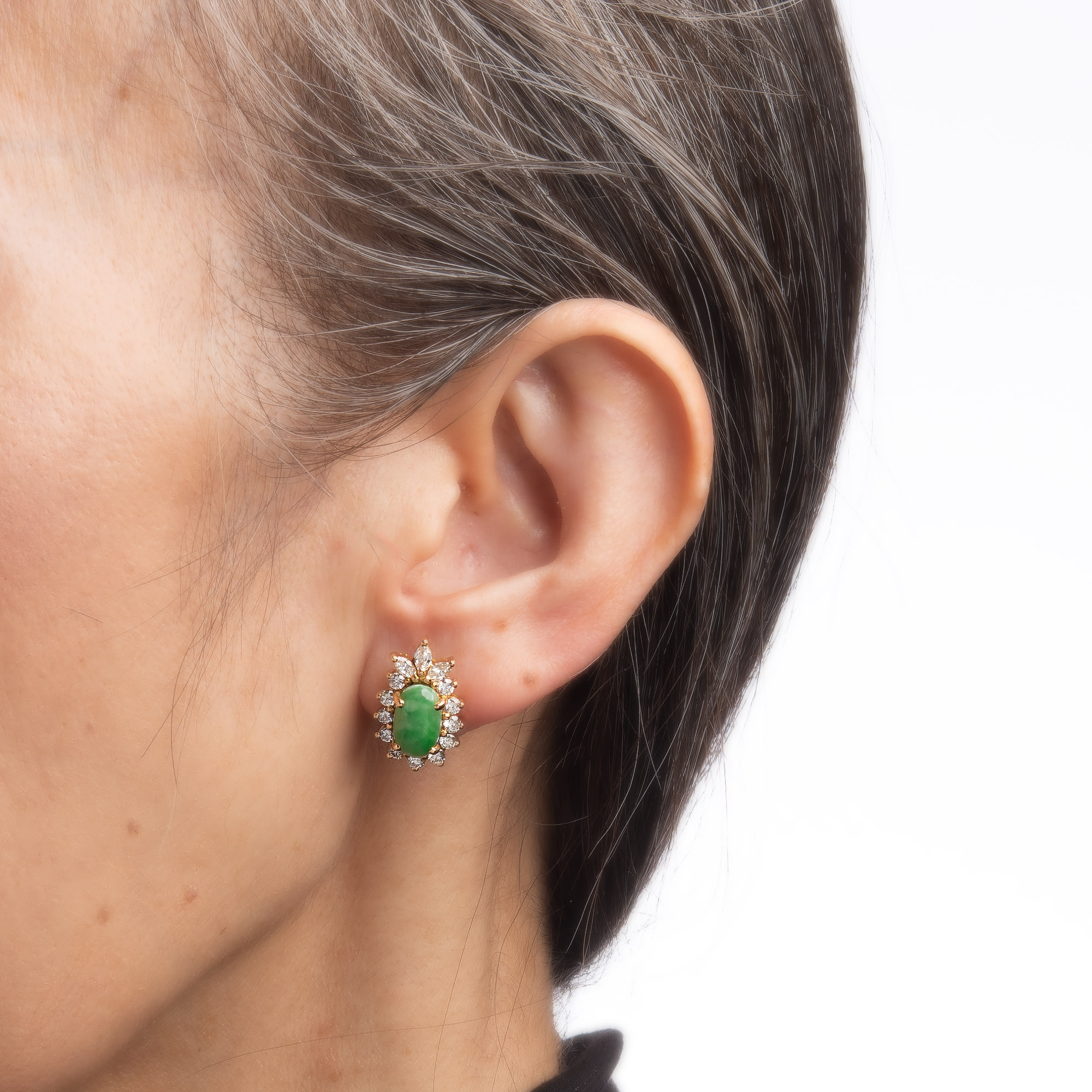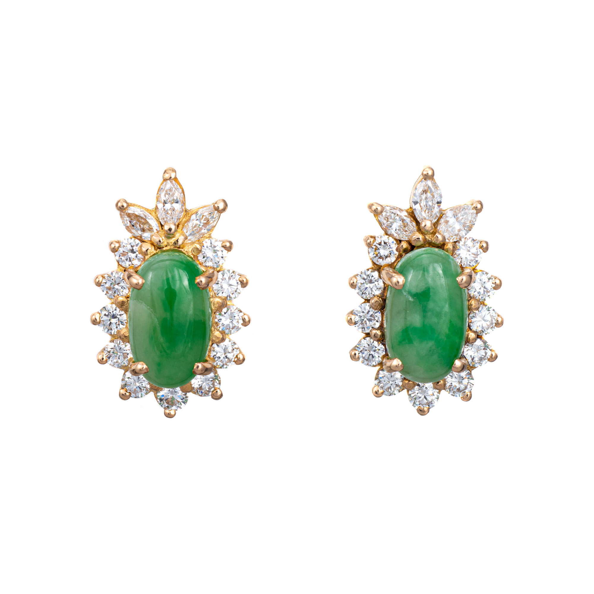 Stones: Round brilliant and marquise cut diamonds total an estimated 2 carats (estimated at H-I color and VS2-SI2 clarity). The jade measures 10mm x 6mm. The jade is in very good condition and free of cracks or chips.Size & Measurements: The earrings measure 18.5mm in length (0.72 inches) and 11.5mm wide (0.45 inches). The earrings are fitted with post and butterfly backings for pierced ears.