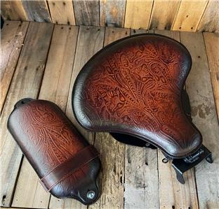 - This set includes a 15x14x1" Brown On Brown Tooled Embossed Cow Hide Leather seat Passenger Pad and Spring Mounting kit.