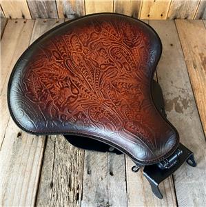 2018-2025 Harley Softail 15x14" Brown On Brown Tooled Leather Tractor Spring Seat and Conversion Mounting Kit with Black Powder Coated Coil SpringsBy Mother Road CustomsMADE IN THE USA