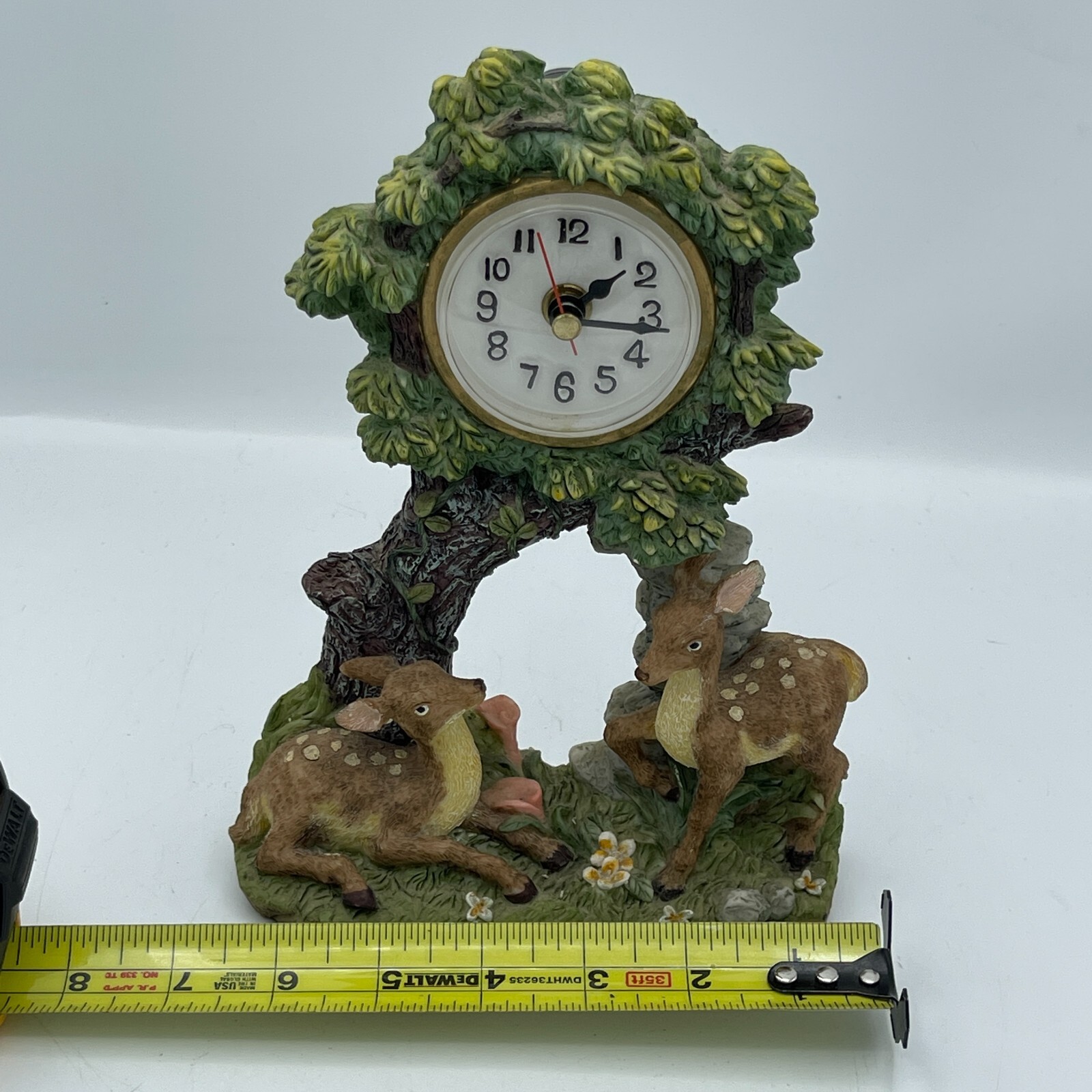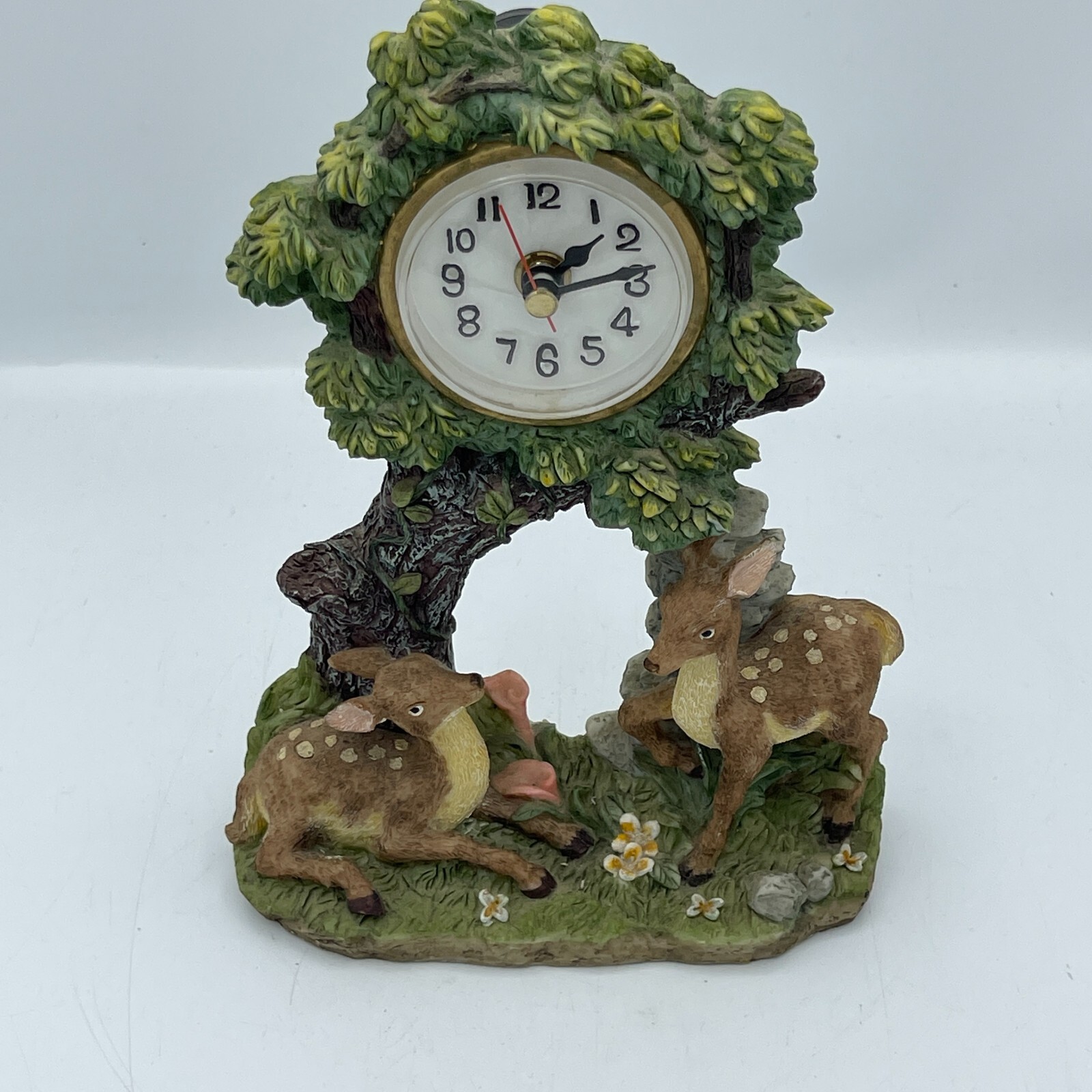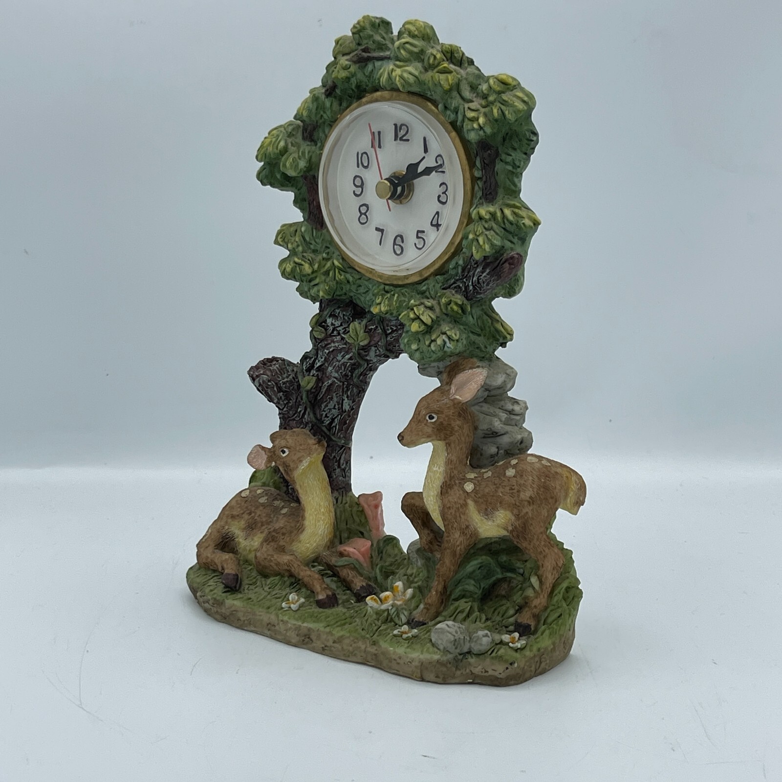 This vintage desk clock features a nature-inspired design with a beautiful tree and deer motif.