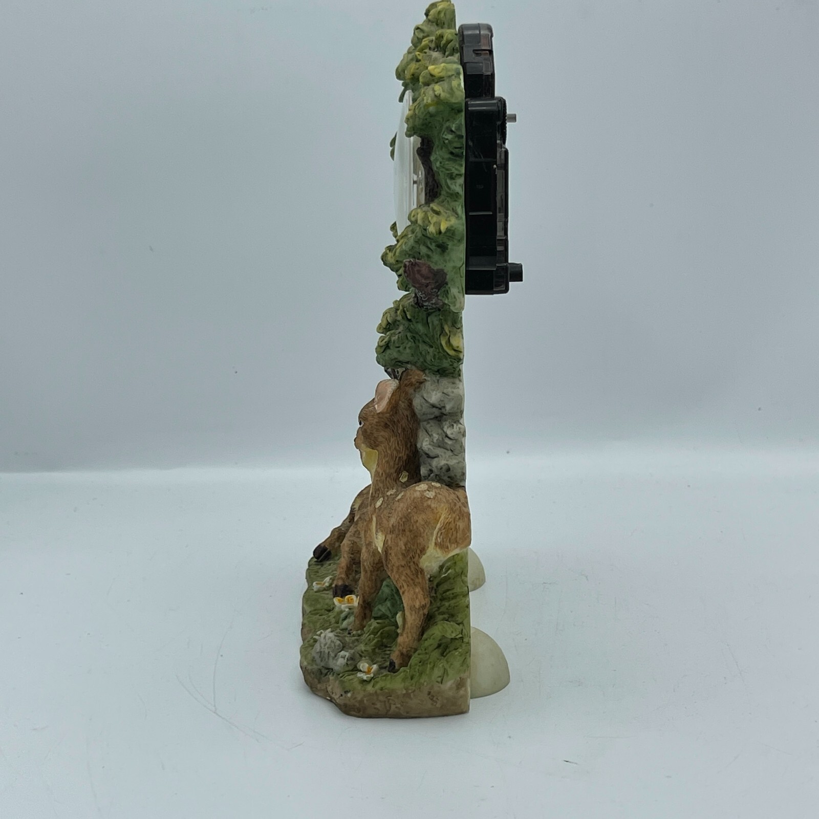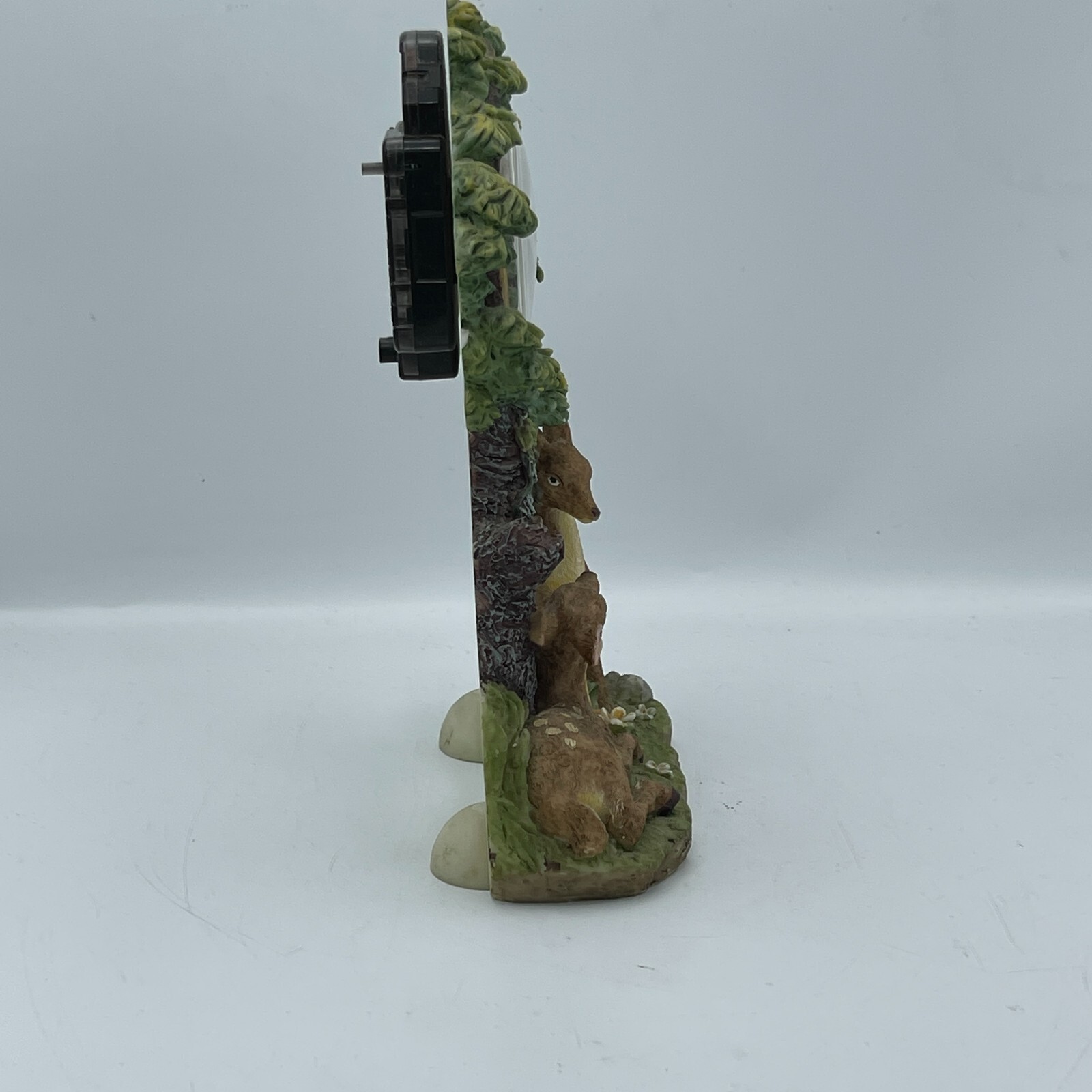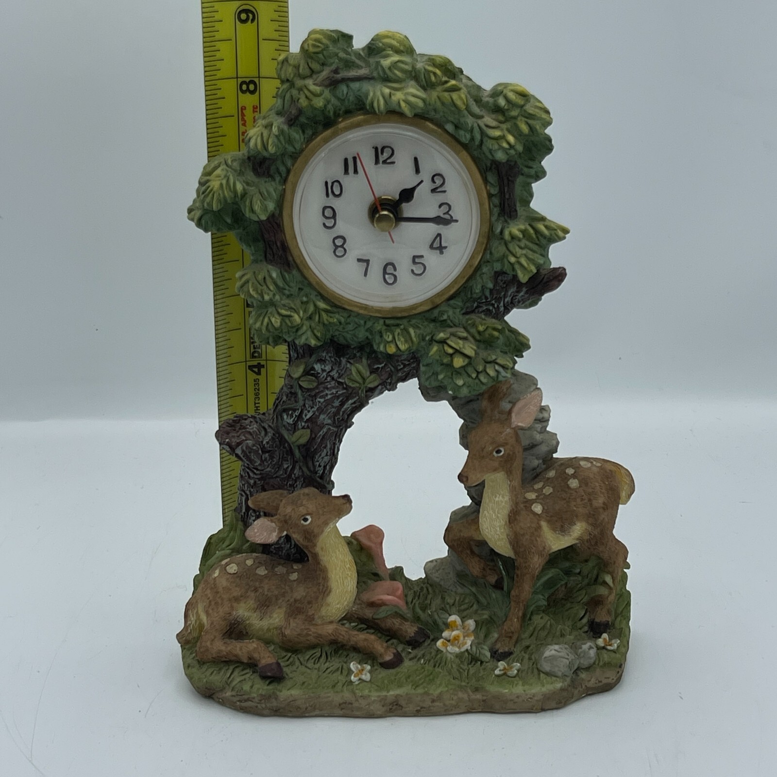 This vintage desk clock features a nature-inspired design with a beautiful tree and deer motif.