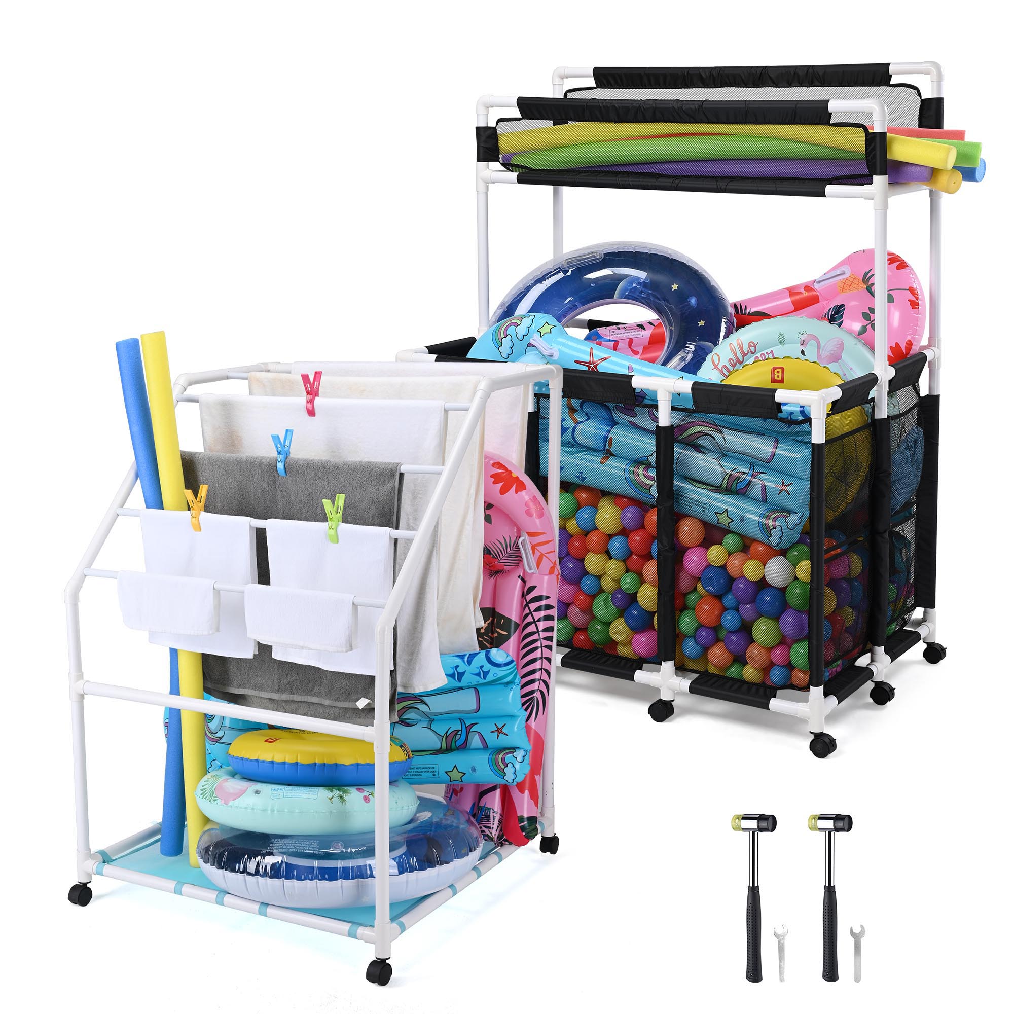 - Maximize Drying Space - Pool Towel Holder features spacious 7-tier cross bars for hanging a large volume of towels and swimwear, while allowing enough space for quick drying. Plus, a breathable mesh bottom shelf for keeping pool floats or swim rings clean and dry