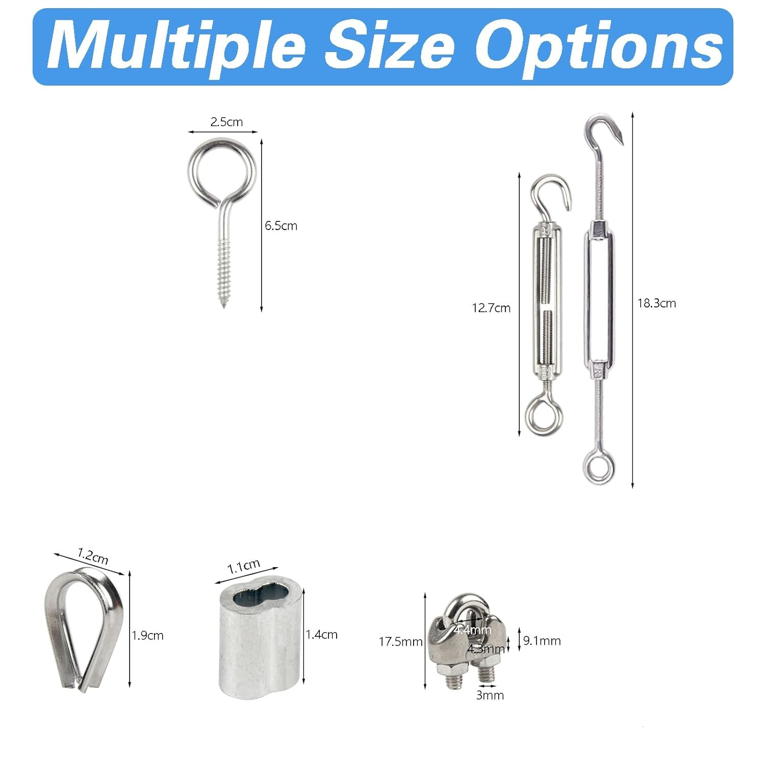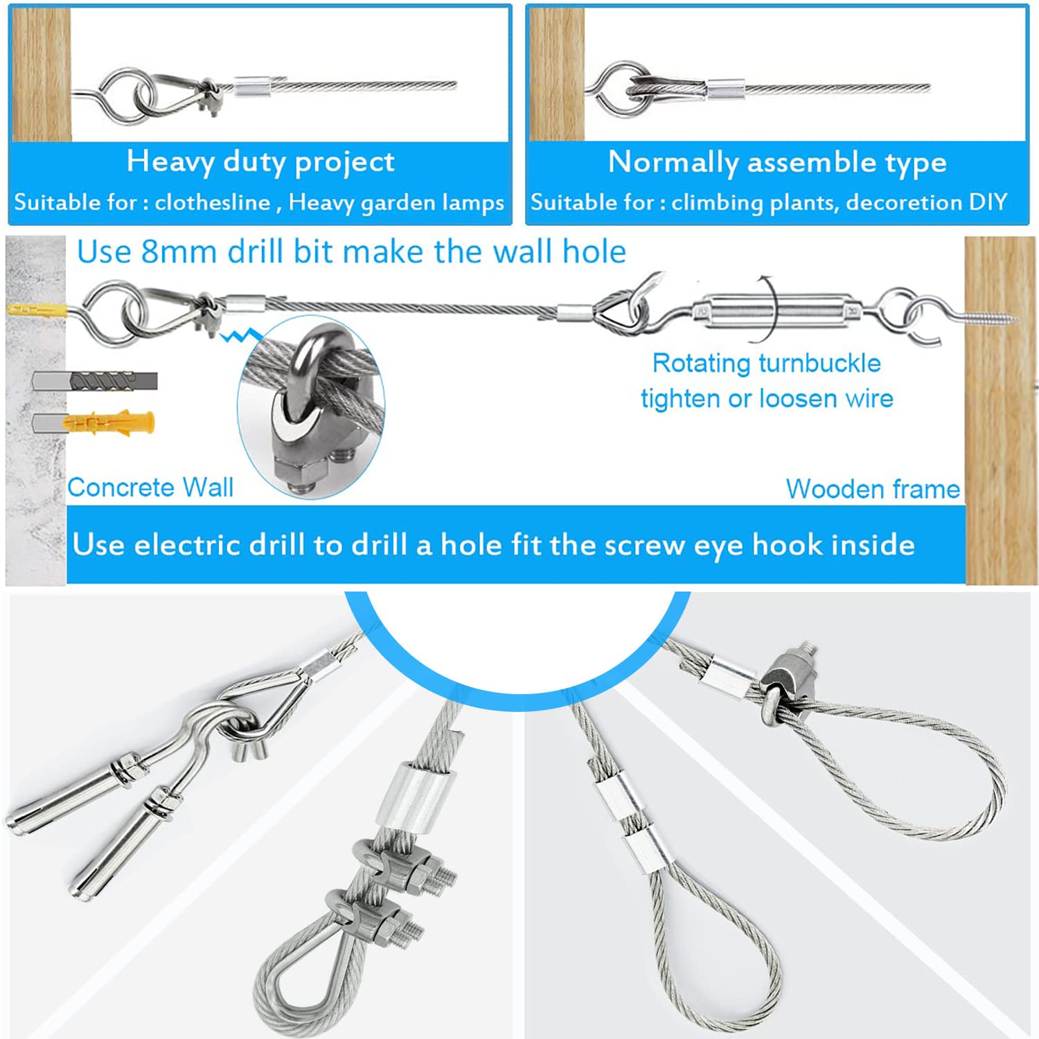 ♧【Easy Installation】: Turnbuckle kit easy to install and remove.First,screw in eye hooks on posts;Then,steel cable with thimbles passing eye hooks or turnbuckles eye,crimping sleeves requires crimping tool(Tips: Recommend remove the coated when crimping wire and make wire are not easily falling off) ;Final,M5 stainless steel turnbuckles hook and eye adjust length you want and then ensuring they remain secure wire rope tension and in place.