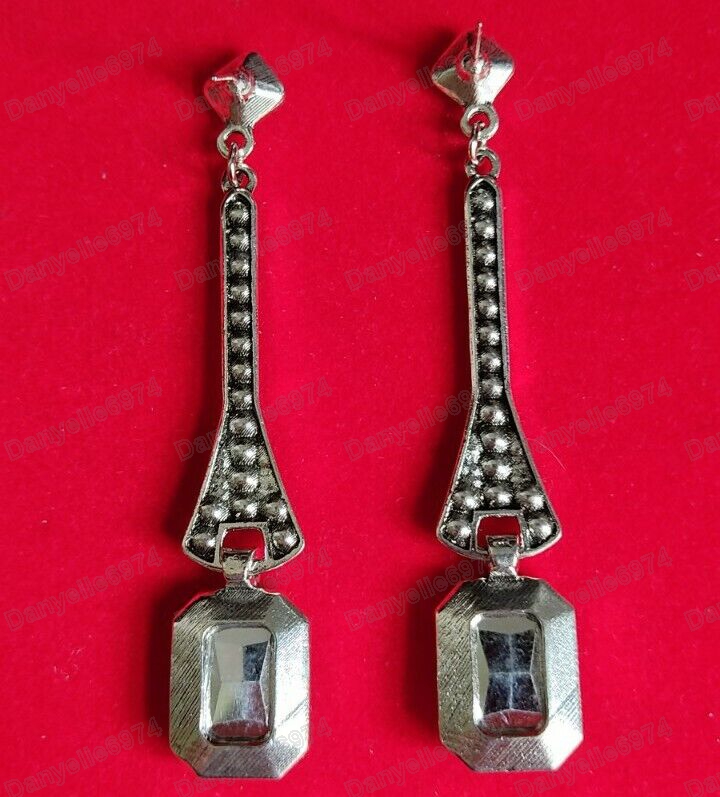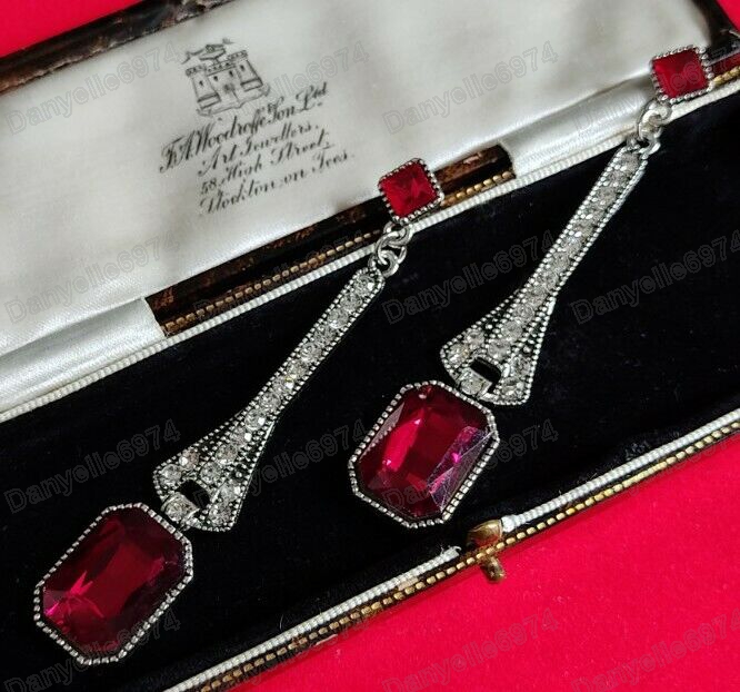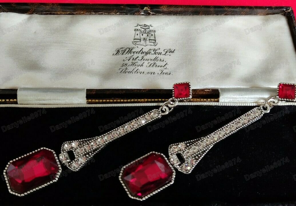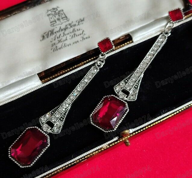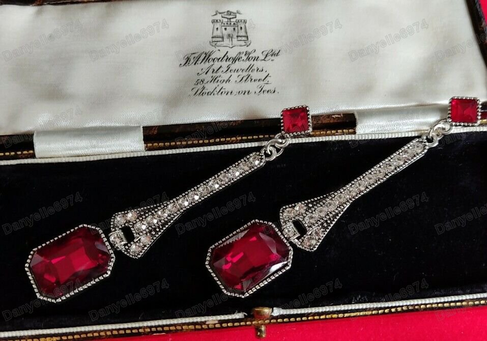 - Long earrings featuring red sparkly austrian crystals with white austrian crystal a set in an art deco vintage style.
