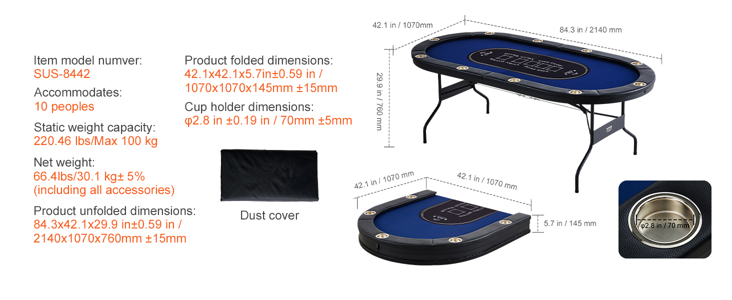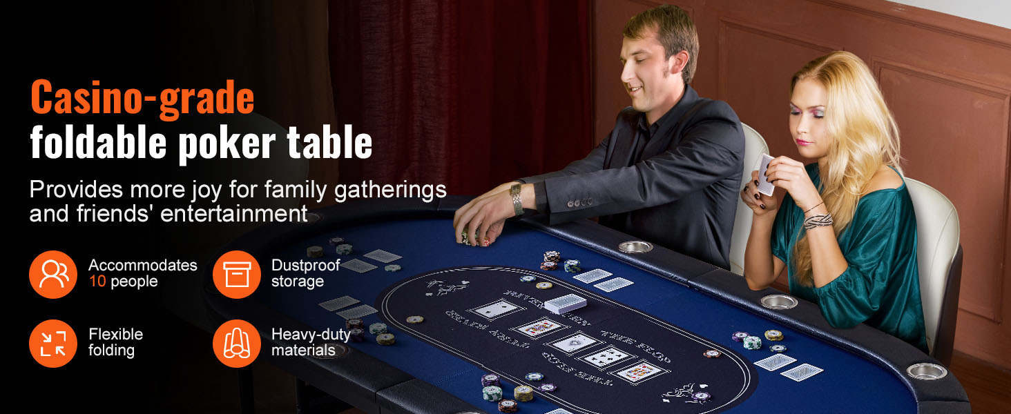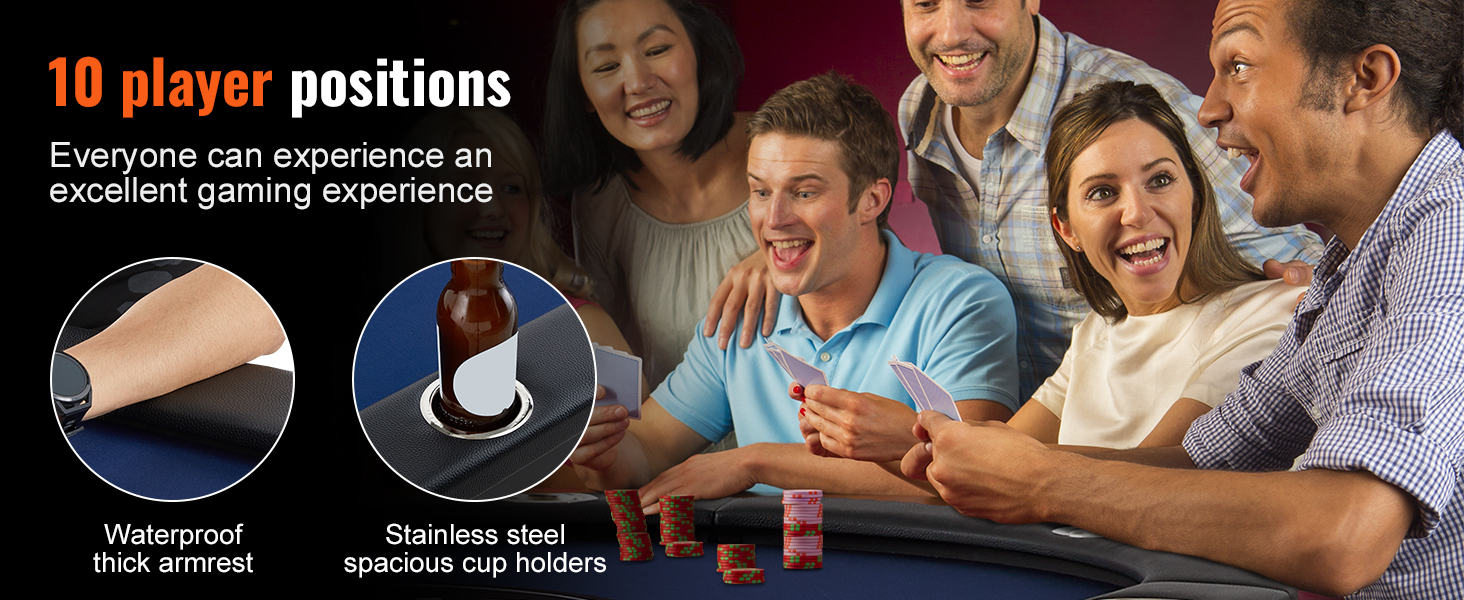 We provide you with a foldable, sturdy poker table designed for entertainment. It easily accommodates 10 players simultaneously. You can enjoy playing games like Texas Hold'em and other card games to your heart's content.