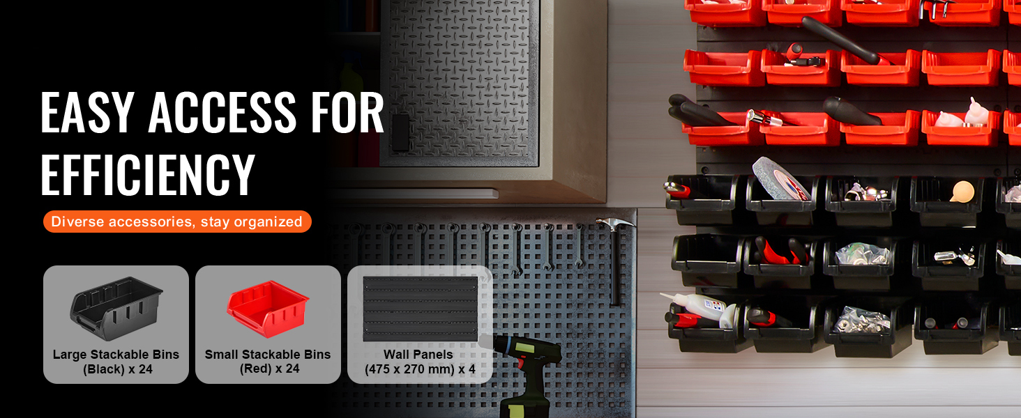 Our parts storage bins come with reinforced plastic supports for efficient stacking. With small red bins and large black bins, you can easily differentiate the contents of each bin.
