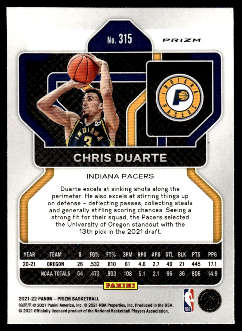 2021-22 Panini Prizm Green Wave Chris Duarte Rookie Indiana Pacers #315