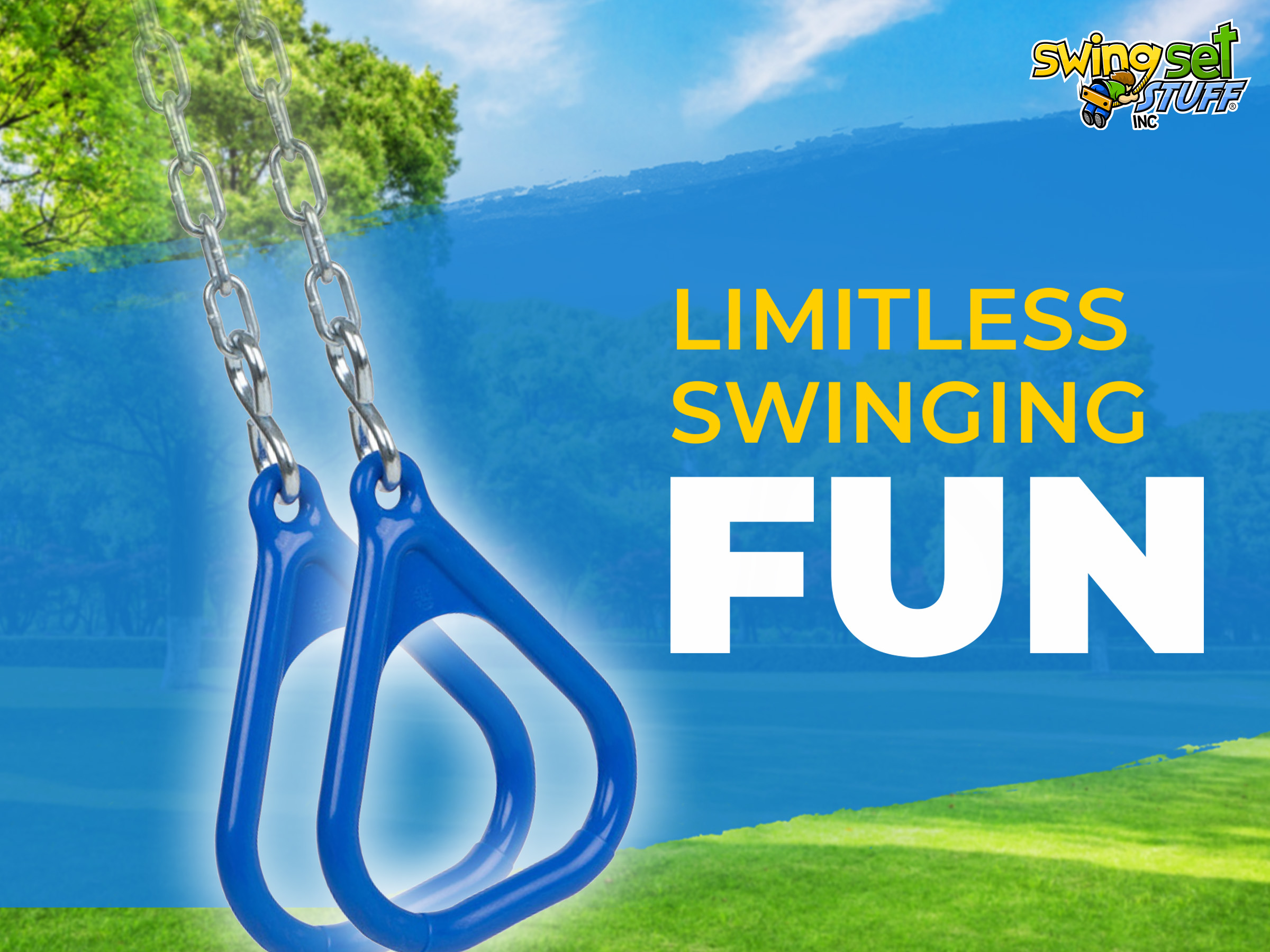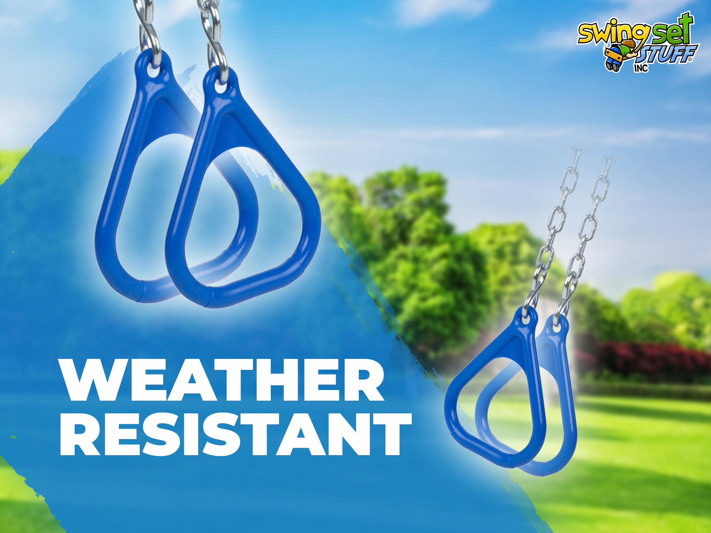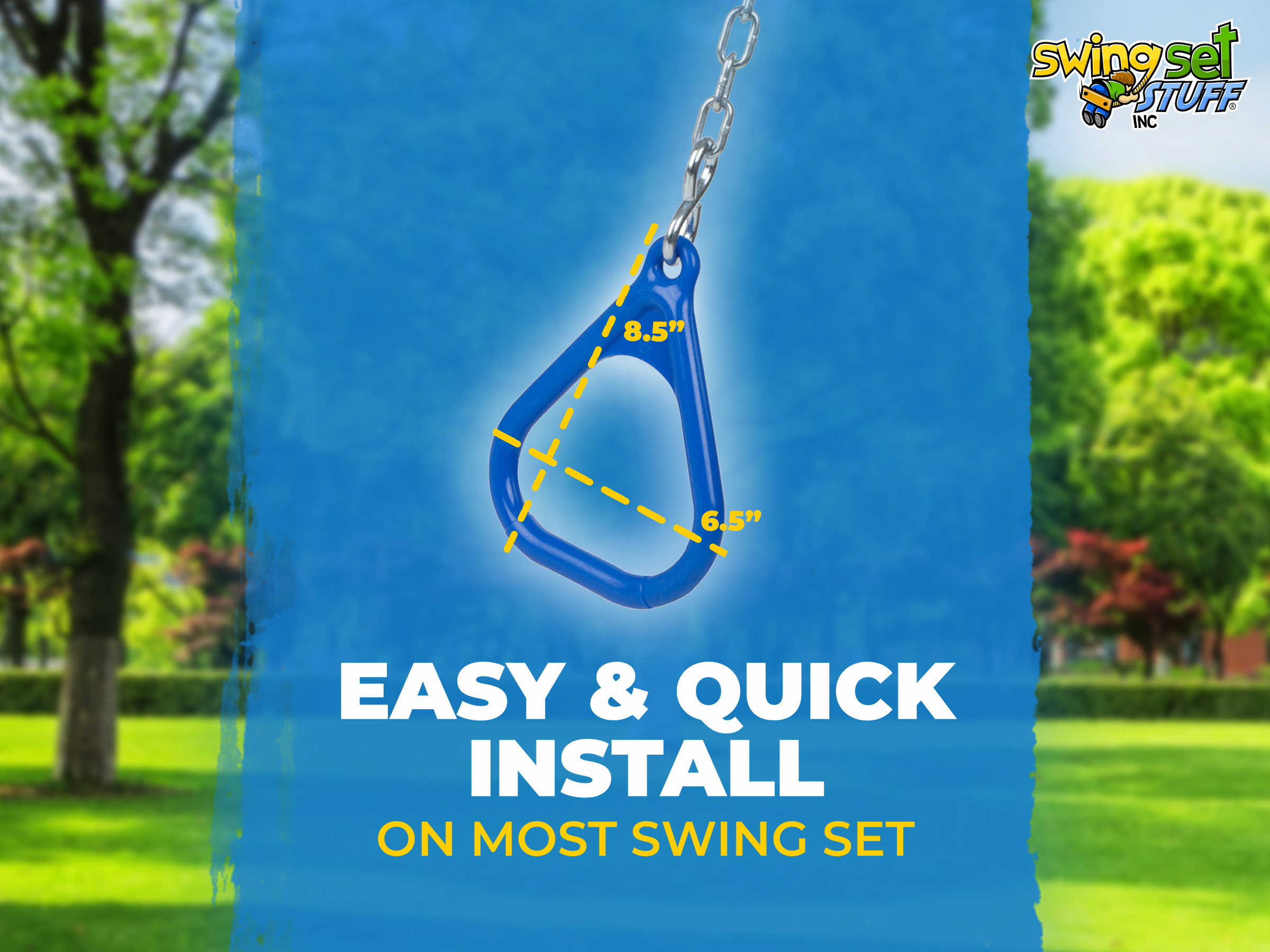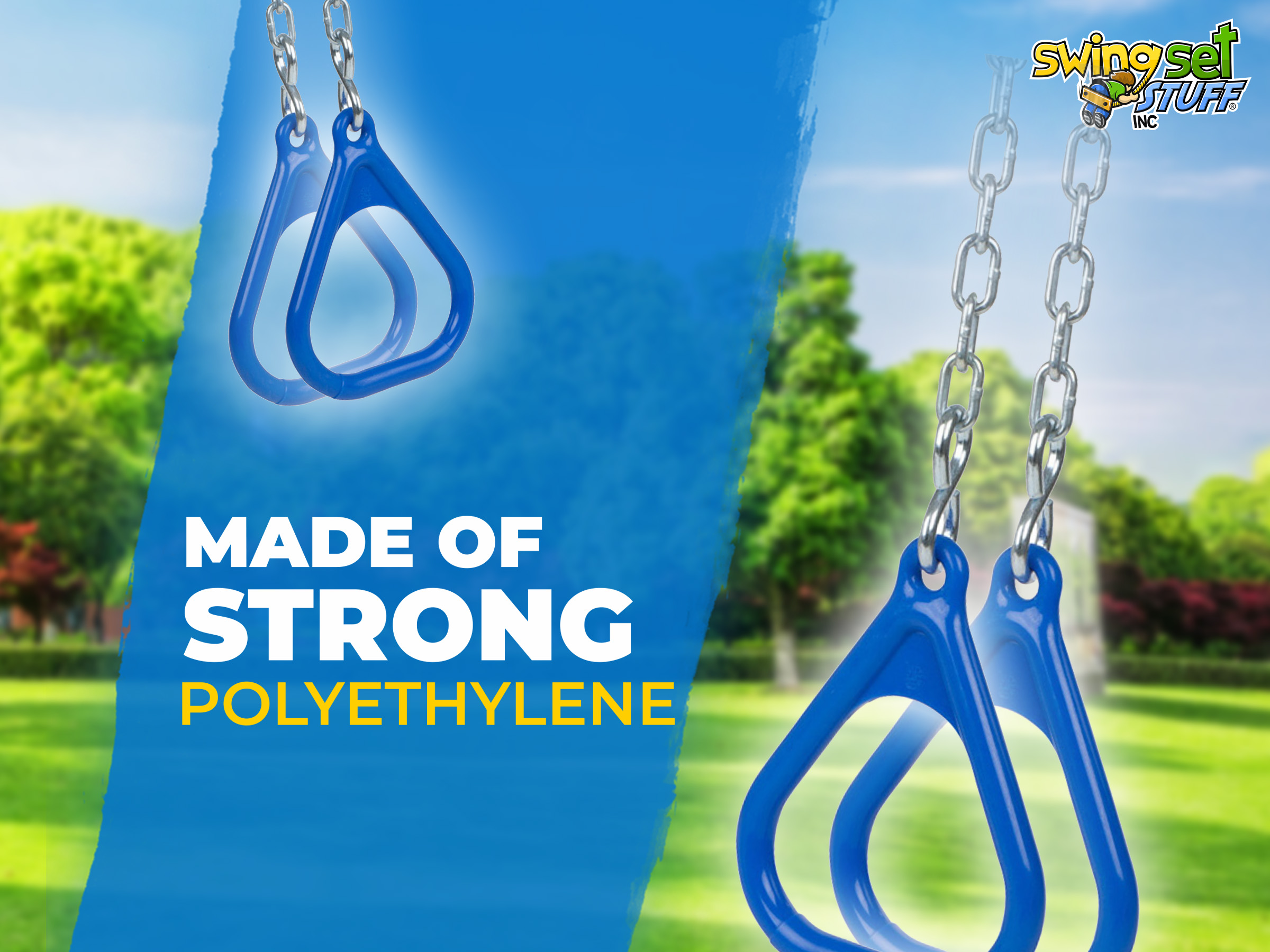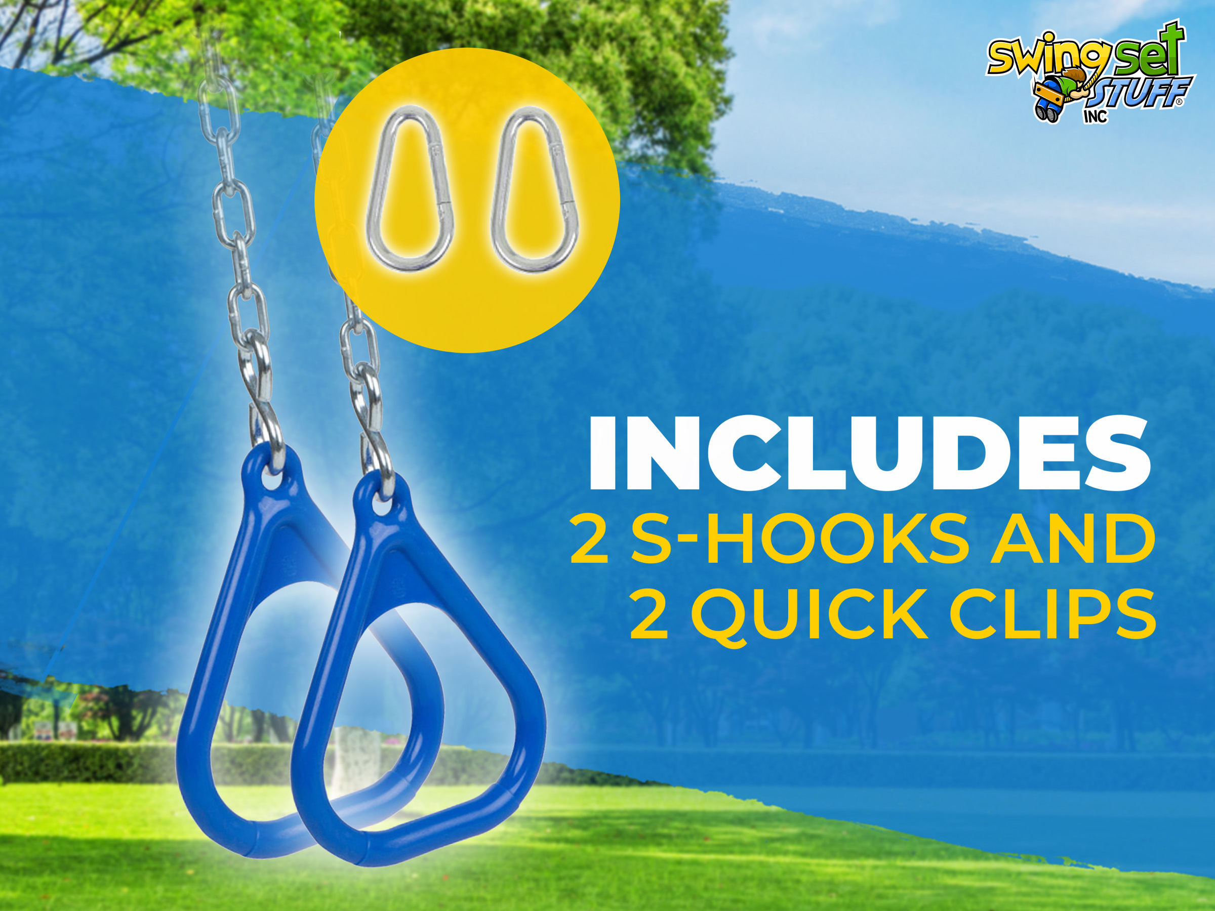 Our polyethylene triangle shaped trapeze rings come in a pair. What is all included in this great buy is a pair of rings, 2 S-hooks, 2 3ft 3/16" zinc plated chain and 2 quick clips. This is fully assembled and ready for you to attach it to your swing set. The standard length of chain is 3ft but if you would like it longer please let us know and we will adjust the price accordingly.
