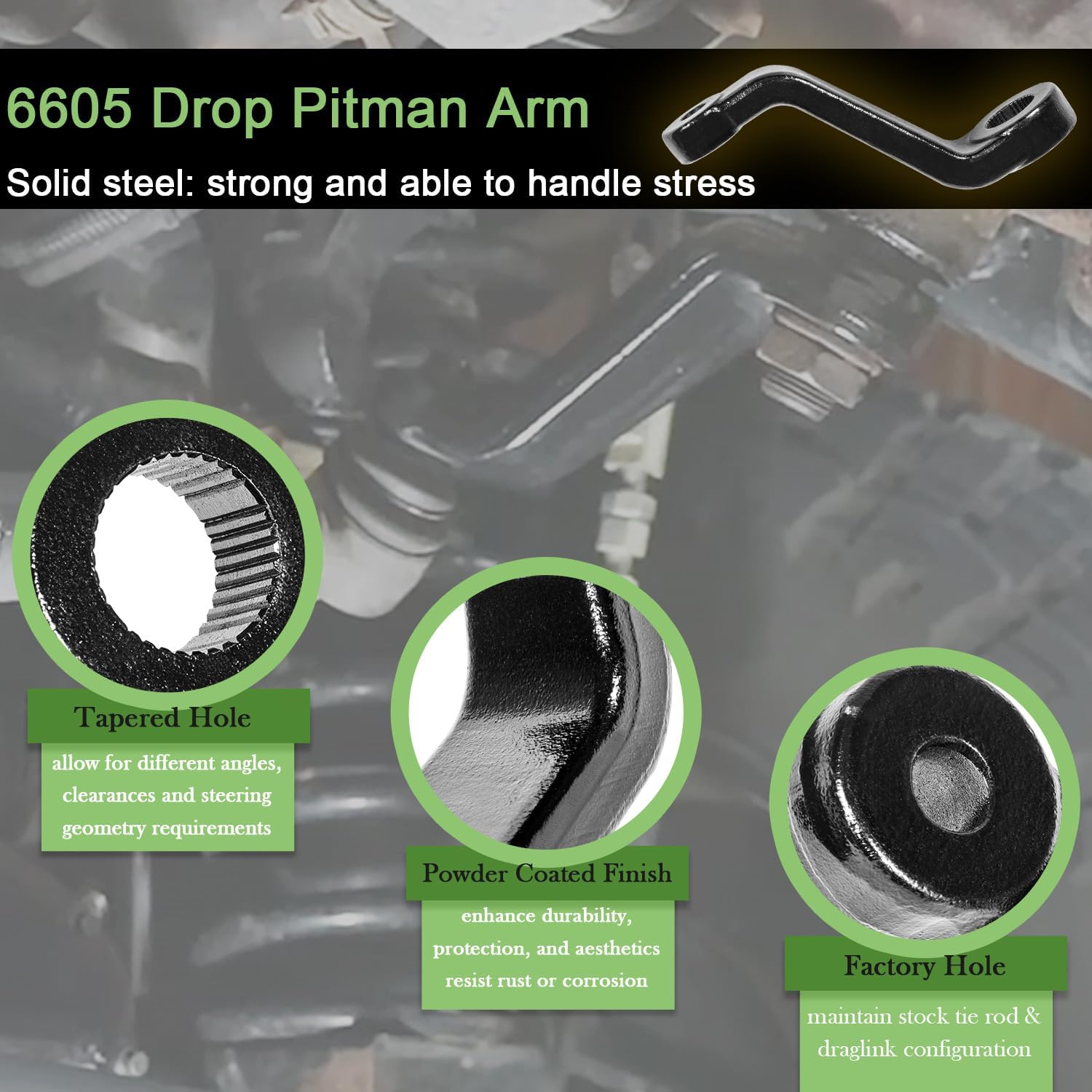 Fitment-- Drop Pitman Arm 6605 compatible with 87-06 Jeep Wrangler YJ & TJ, 84-01 Cherokee XJ & Comanche MJ. Perfectly fit for Wrangler YJ with 2.5” to 4” lift, Wrangler TJ with 2.5” to 6” lift, Cherokee XJ & Comanche MJ with 4.5” lift.