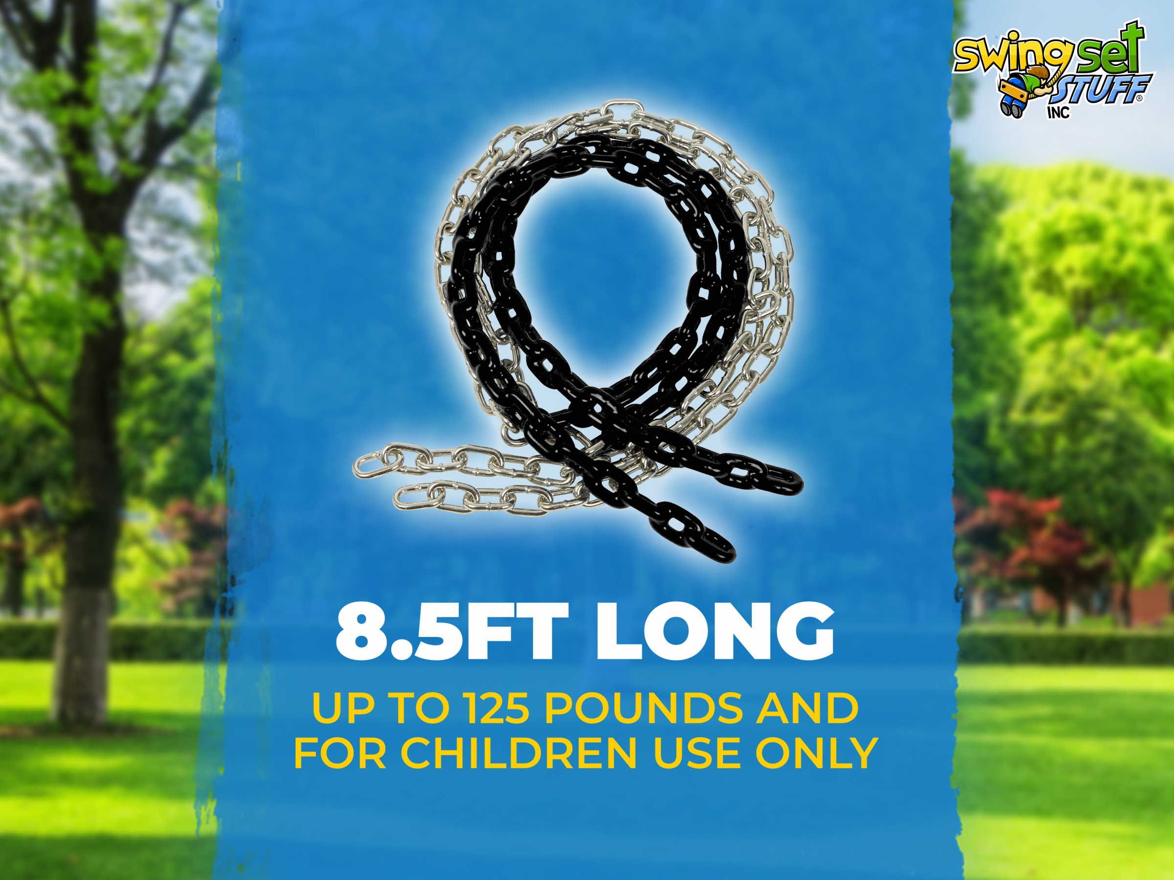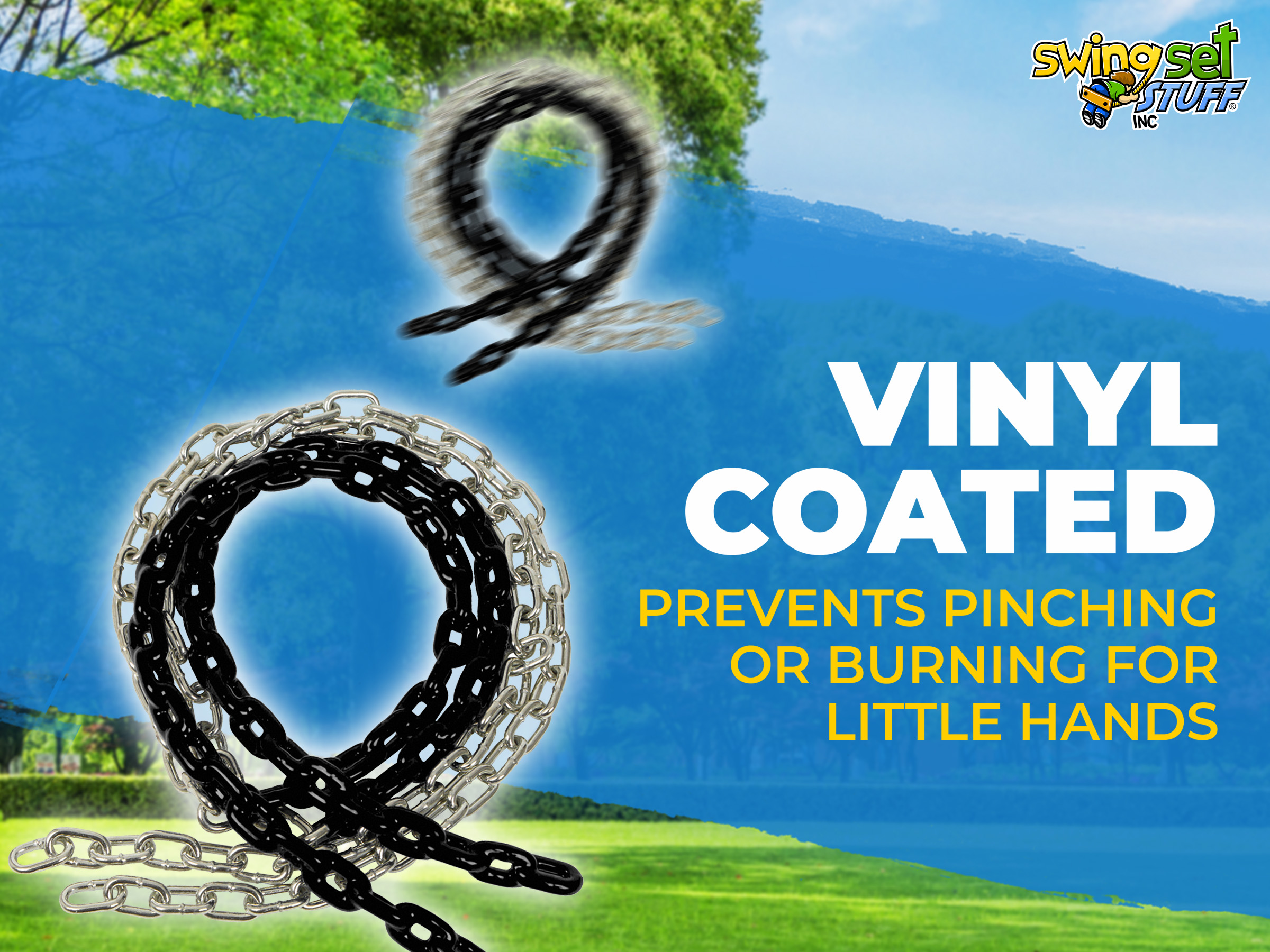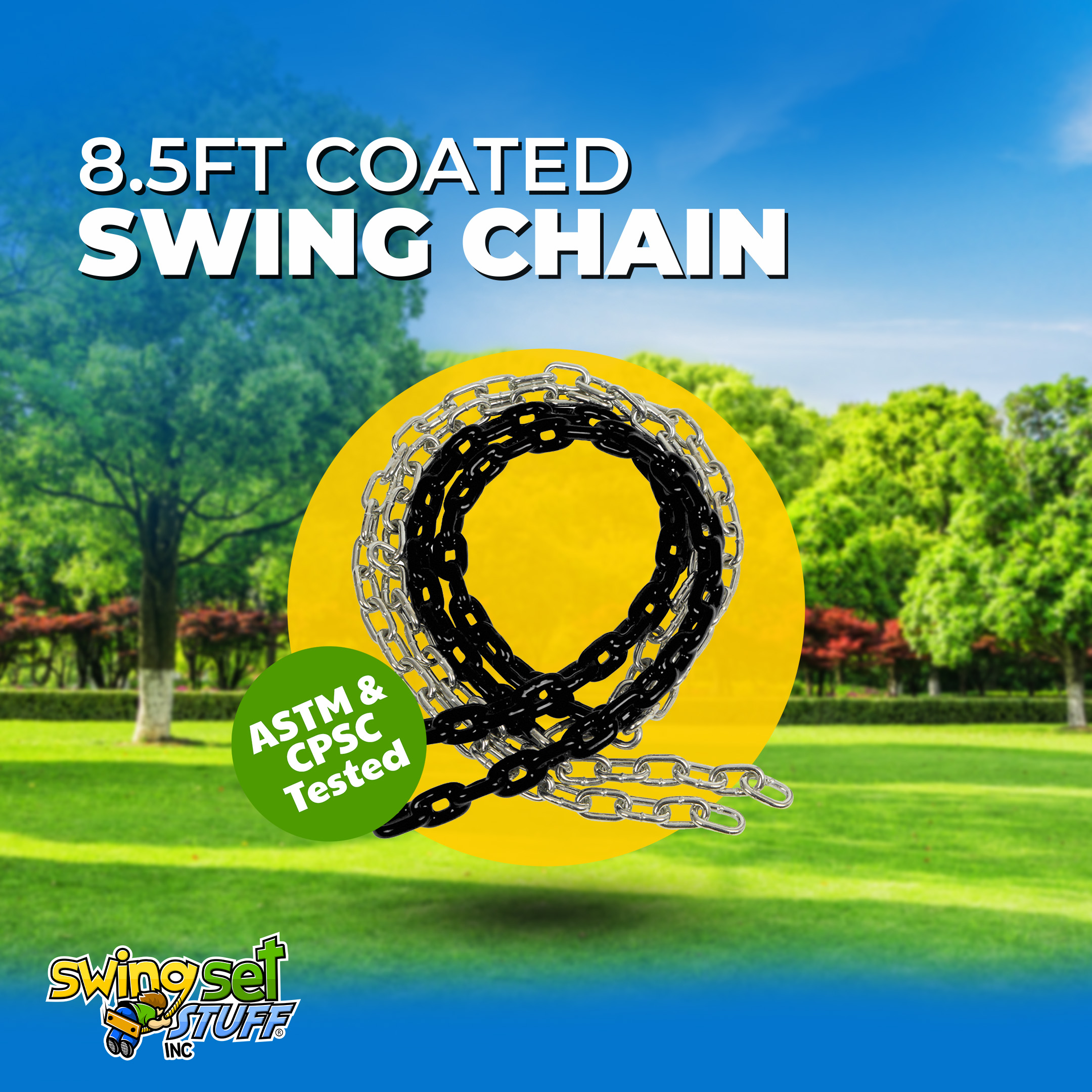 This 8 1/2 ft. swing chain will help add color to your swing seats. These are made so your child's hands will be pinch-free and are a perfect fit. They are zinc plated links to help prevent rust and vinyl coated. Chain is 3/16" in diameter. Made for commercial and residential use these coated chains are extremely durable. They come in pairs.