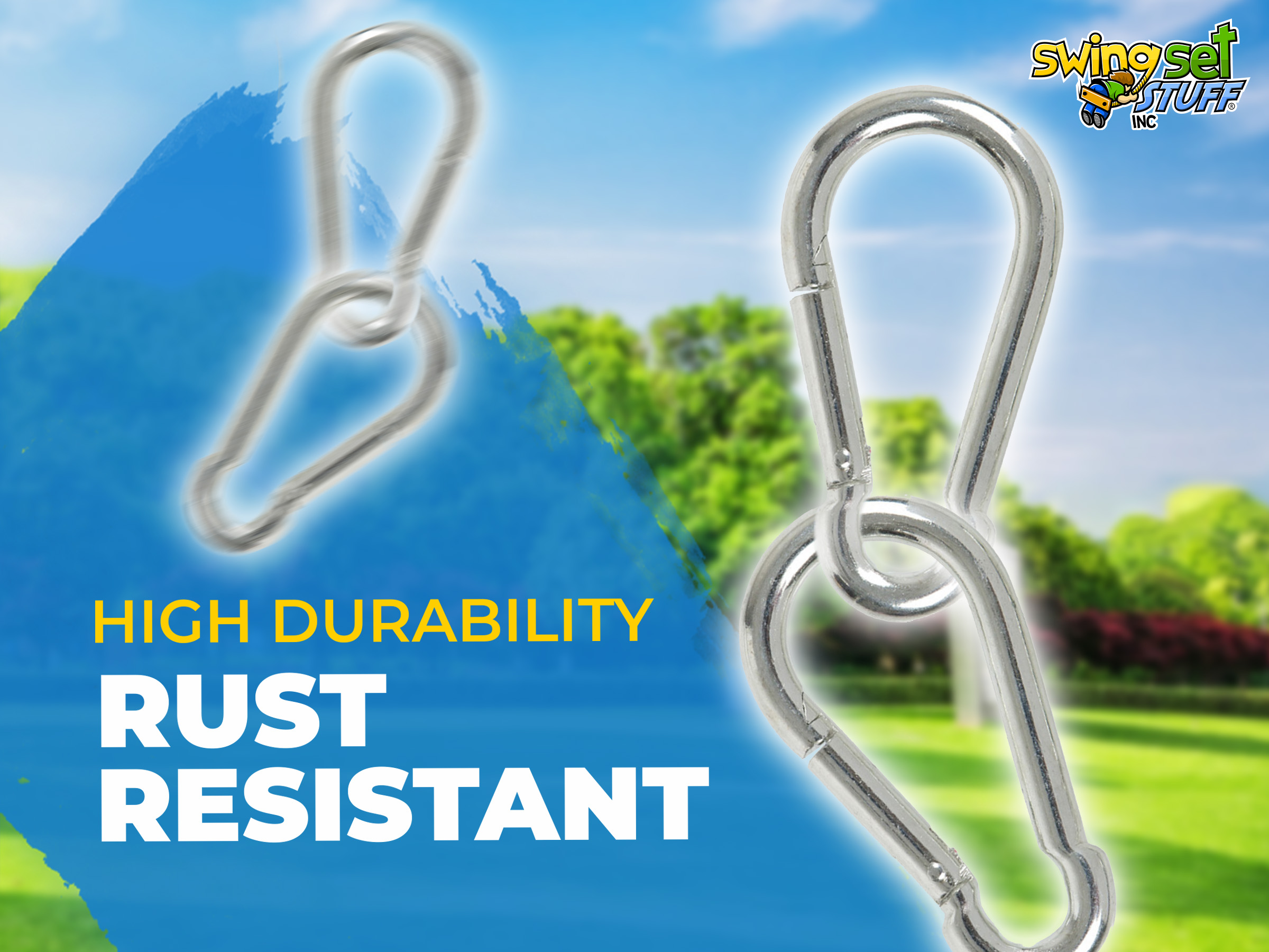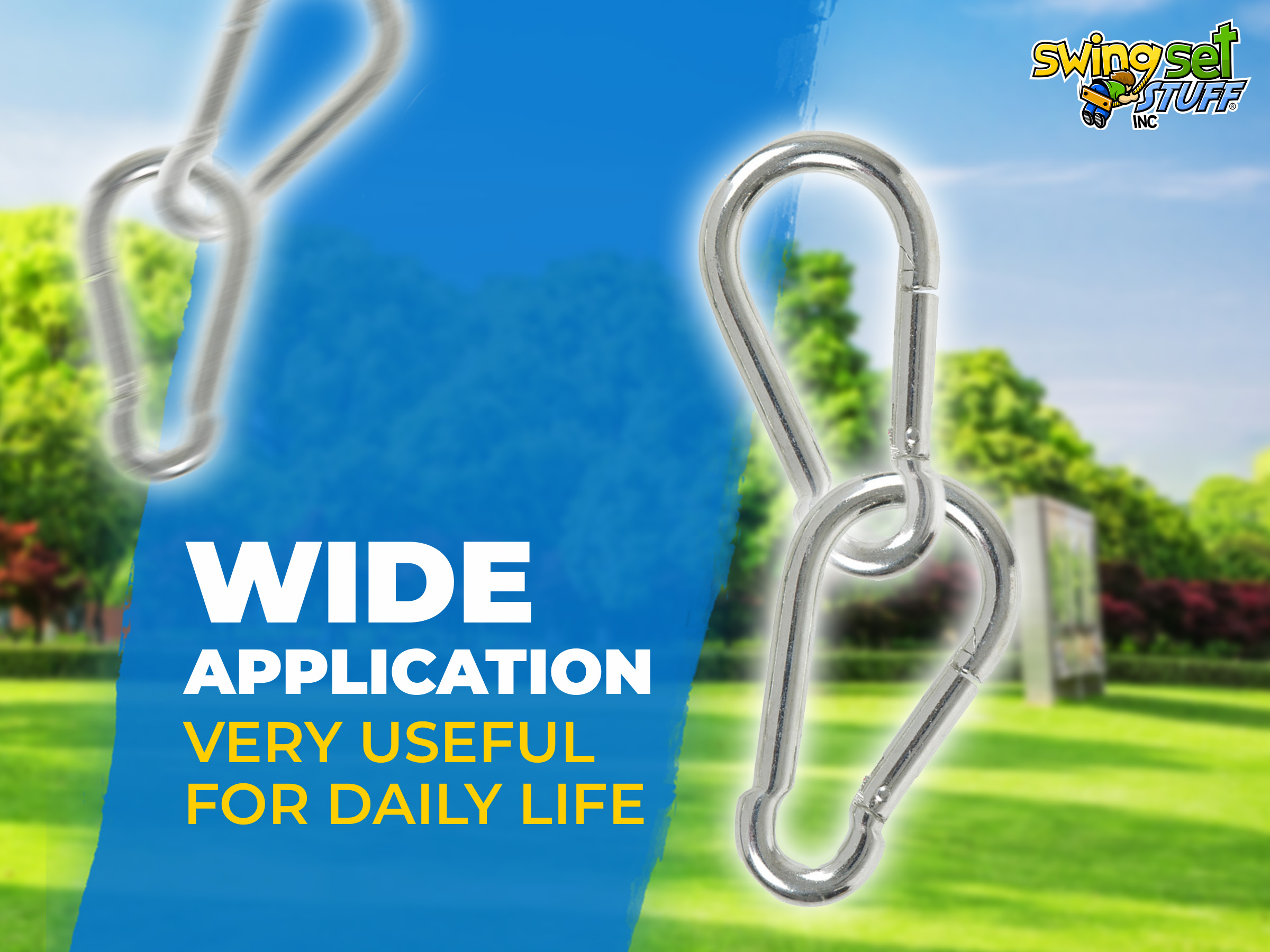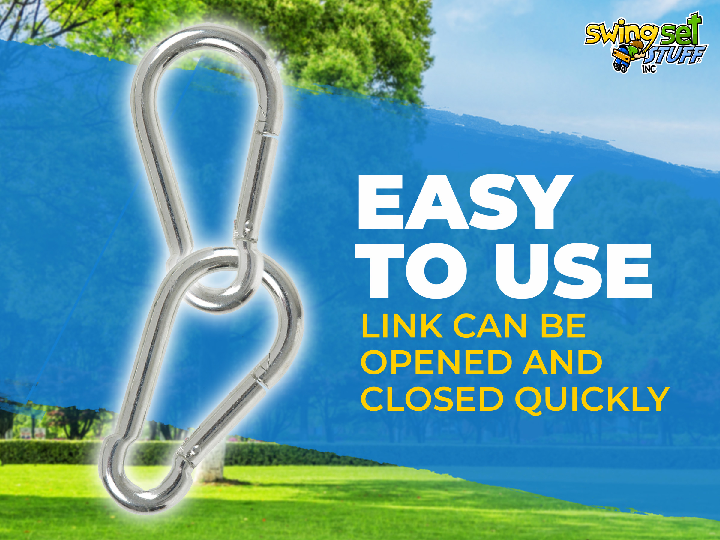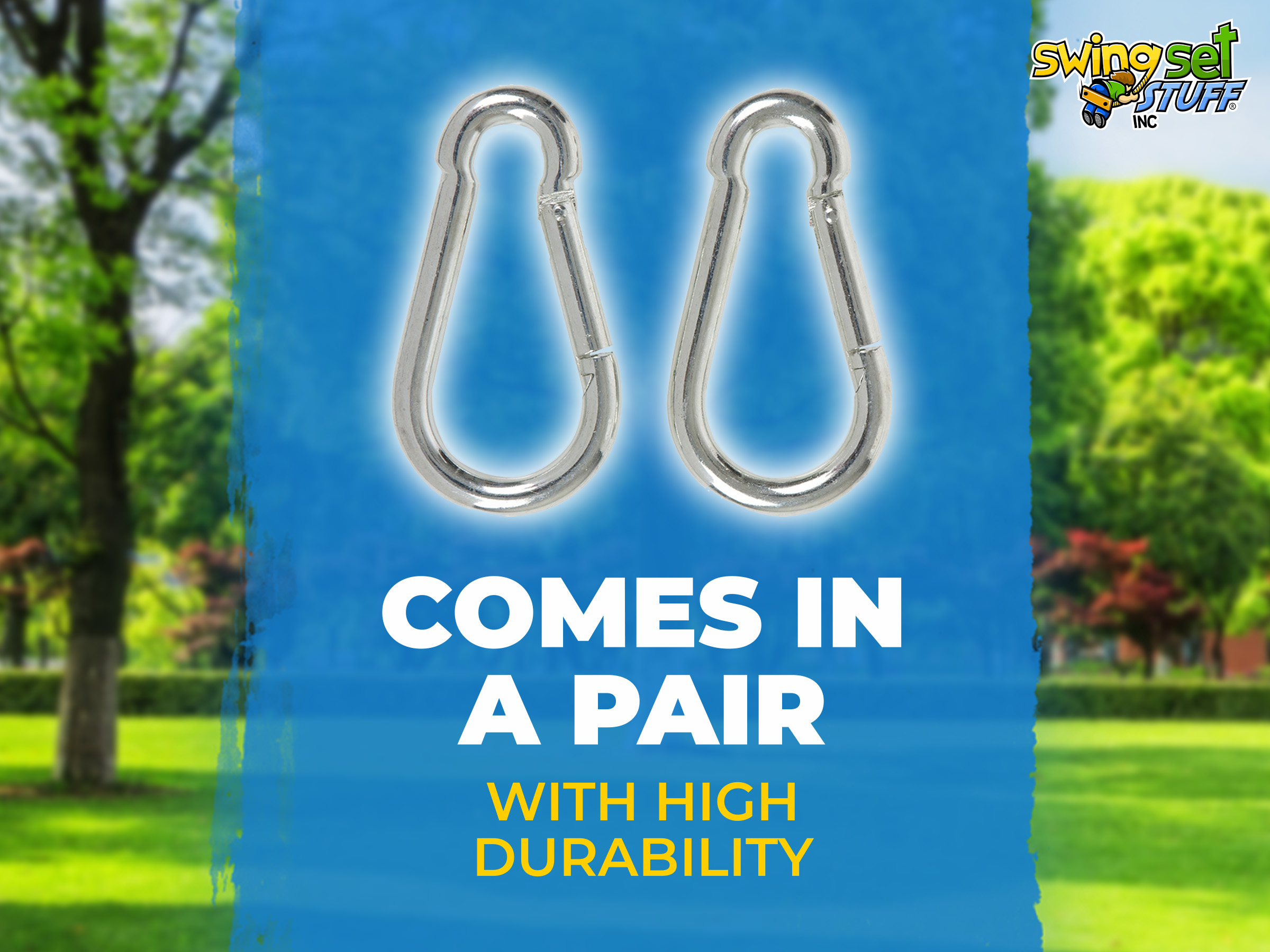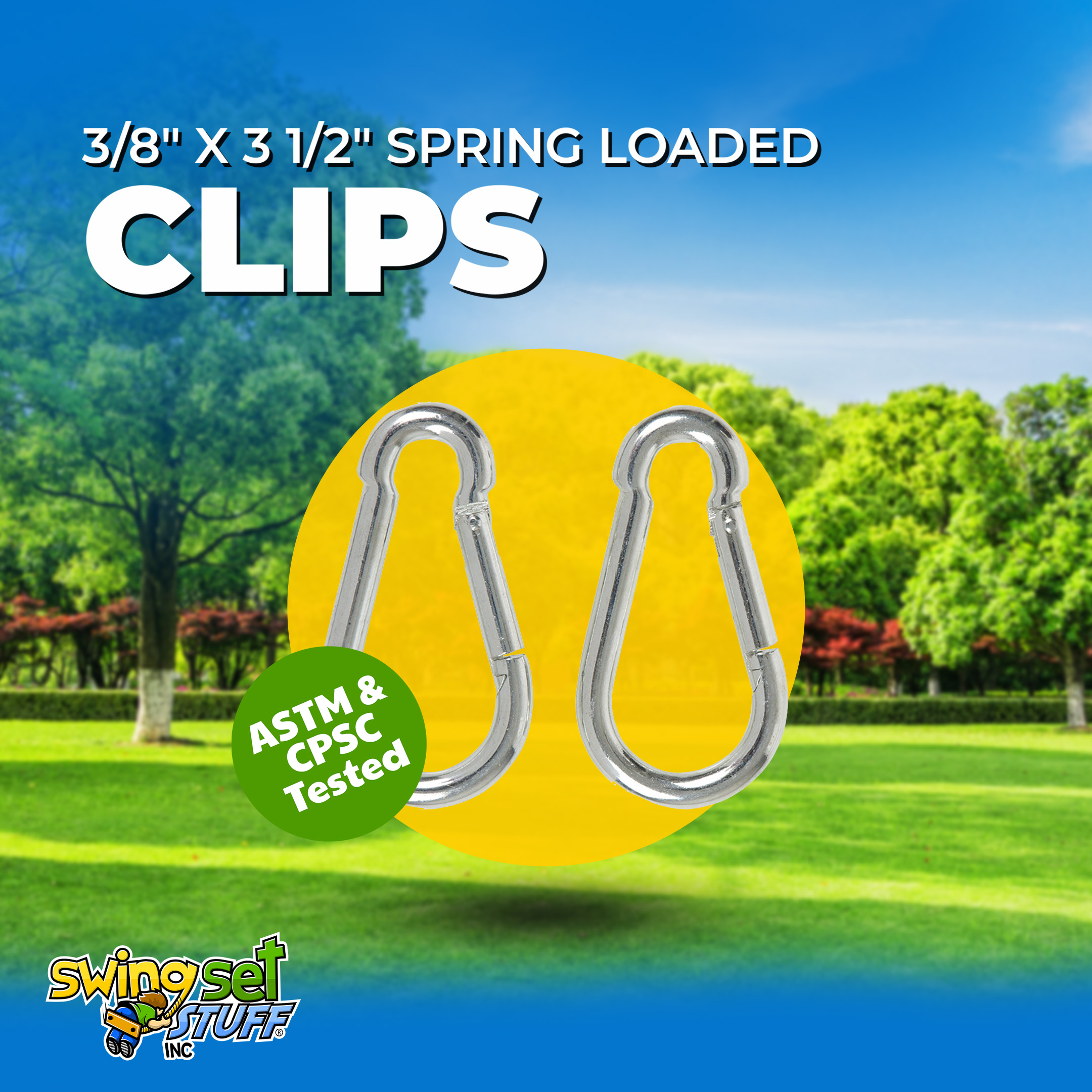 Our 3/8" X 3 1/2 Spring Loaded Connector Clips allows easy attachment to your swing set without bending. They are sold in pairs.
